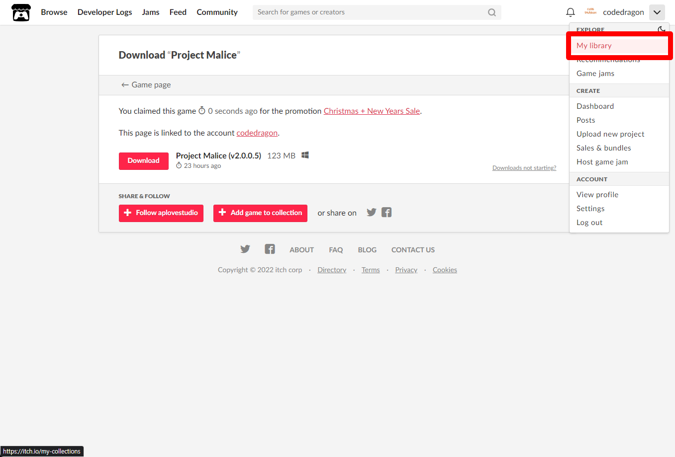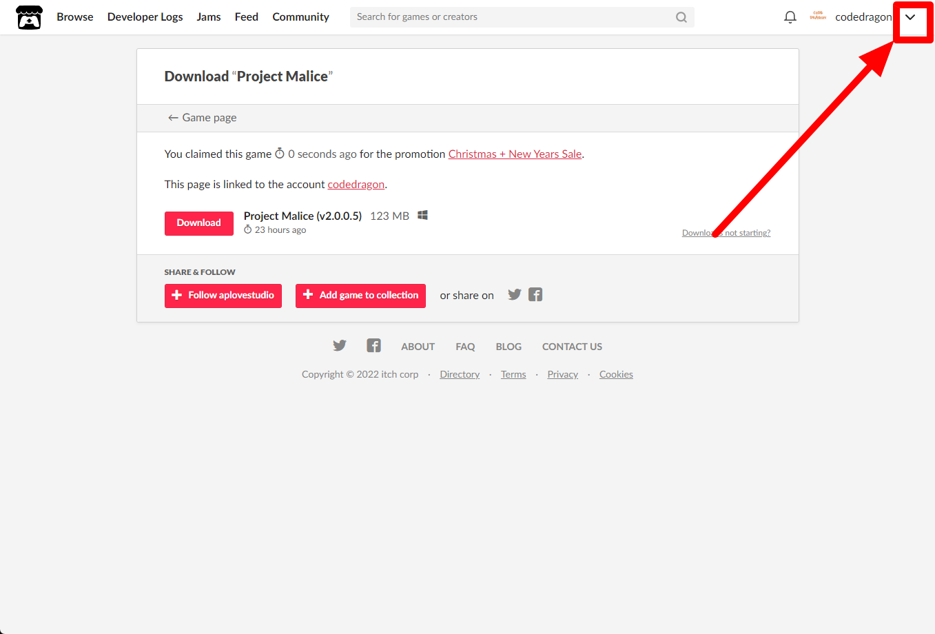 itch.io에서 받은 "Project Malice" 게임 확인하고 설치파일 다운받아 보겠습니다. 우측 상단의 나의 사용자명 오른쪽의 화살표 아이콘을 클릭합니다.