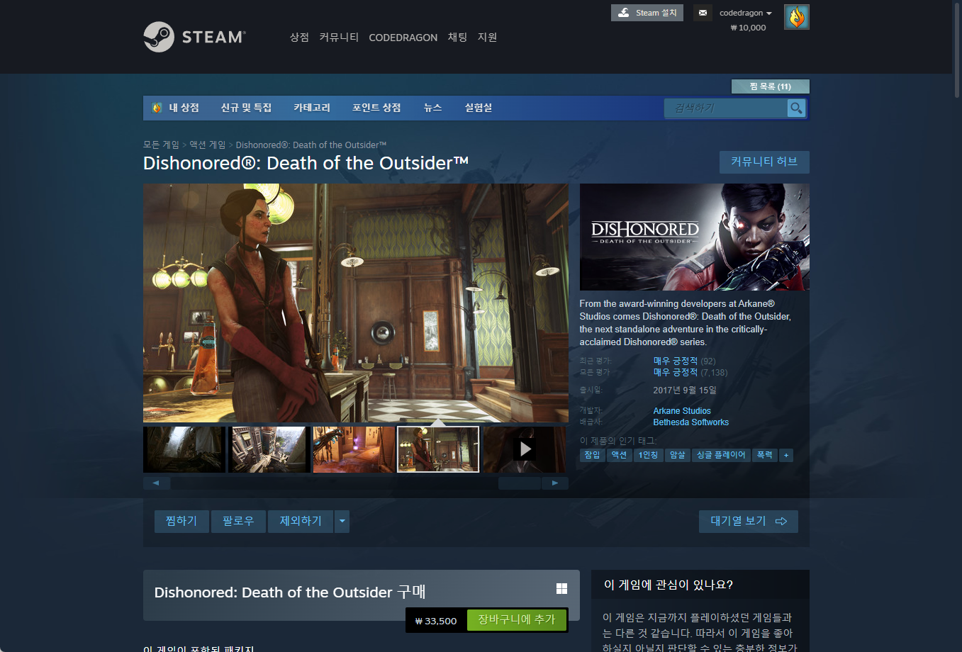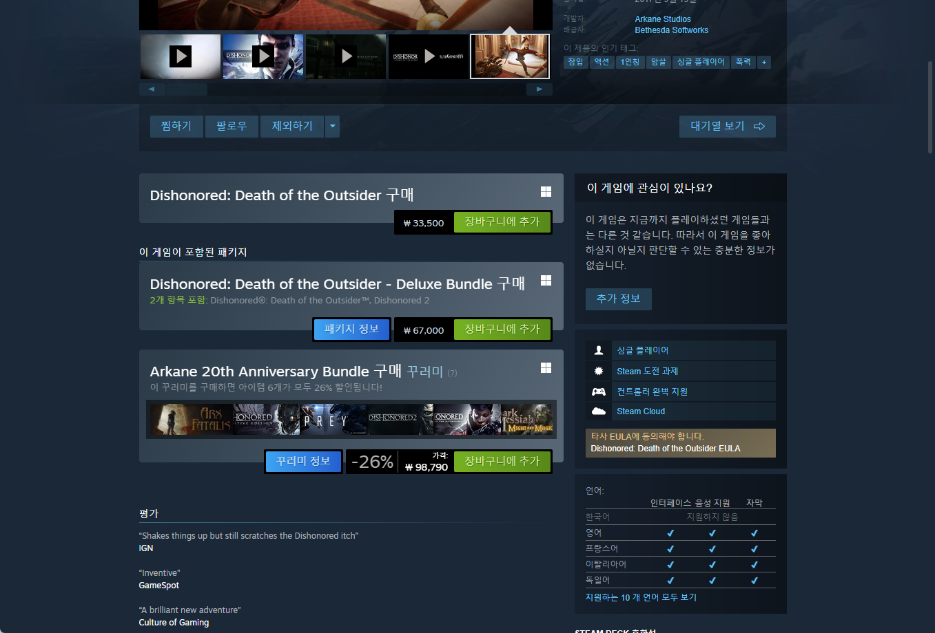 "Dishonored: Death of the Outsider" - Steam 스팀 게임 페이지
