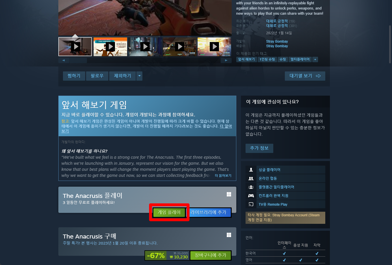 "The Anacrusis" 게임페이지를 조금 내려서 [게임 플레이] 버튼을 클릭하면 됩니다.