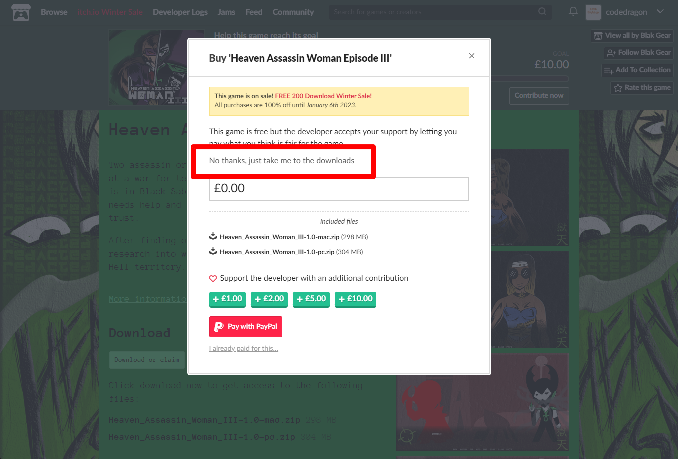"Heaven Assassin Woman Episode III" 구매창에서 [No thanks, just take me to the downloads] 링크를 클릭합니다.
