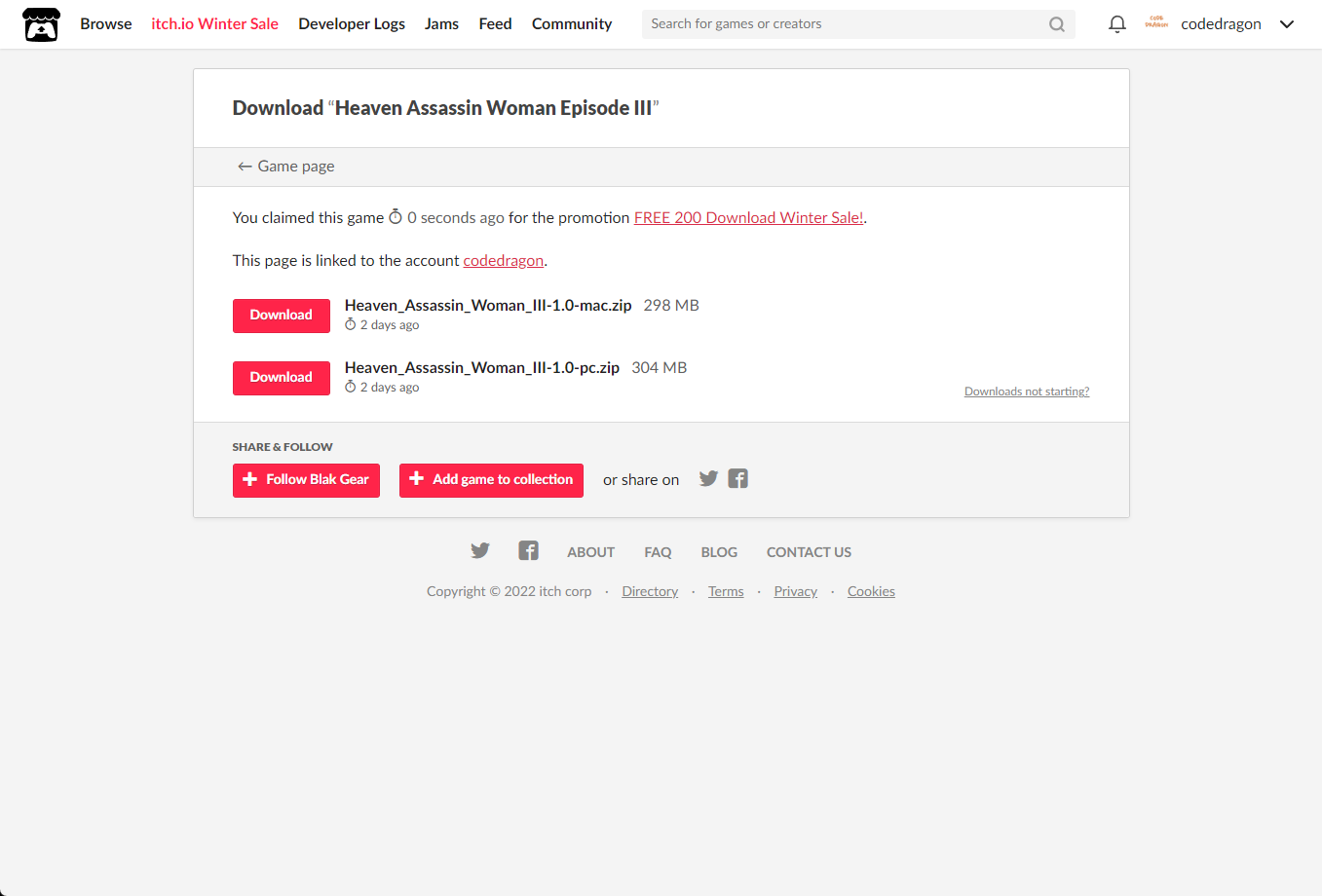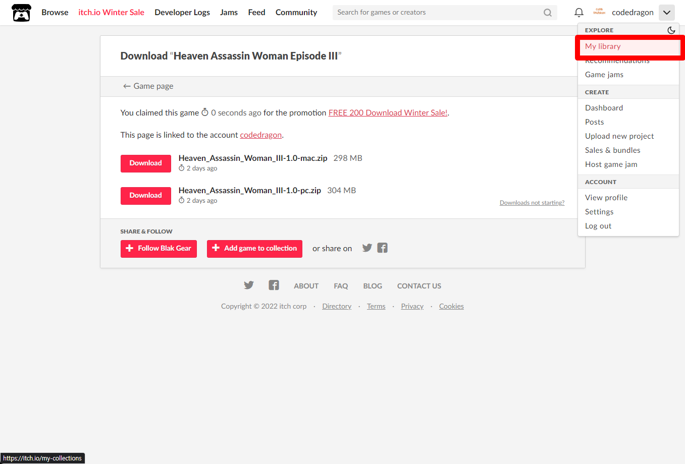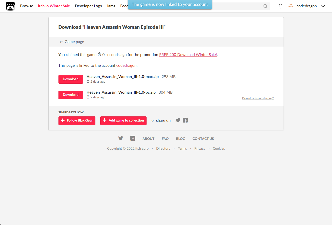 [Claim game]을 클릭하면 "Heaven Assassin Woman Episode III" 게임이 나의 게임 라이브러리에 추가되고 설치파일을 다운받을 수 있는 페이지로 이동됩니다.
