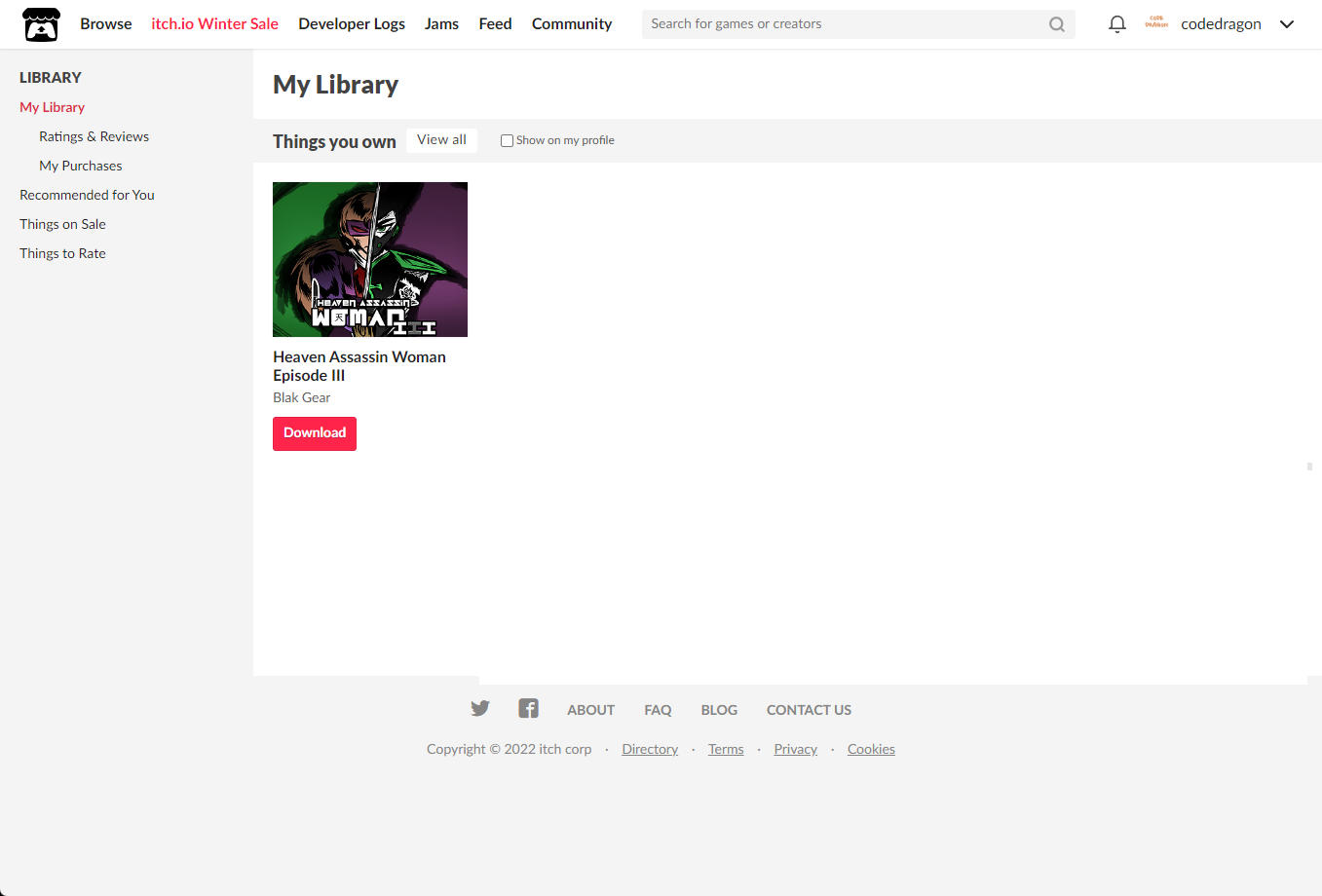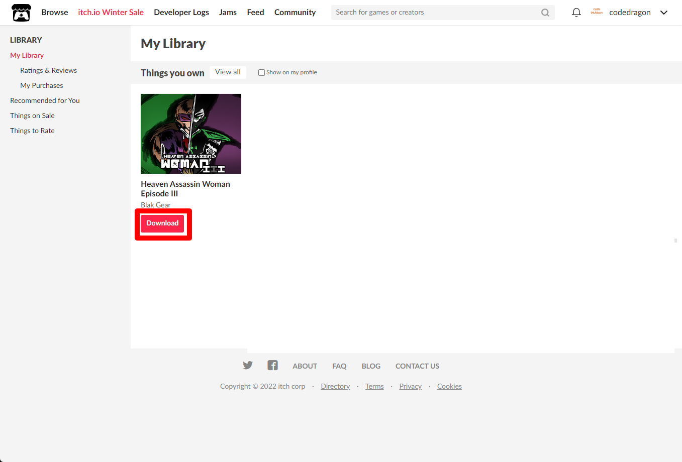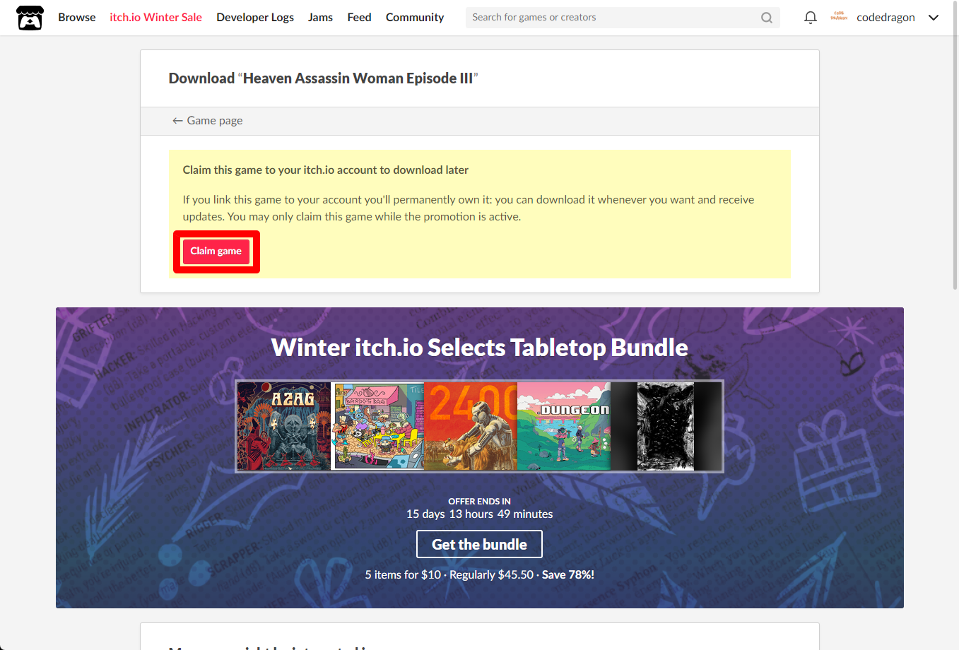 [Claim game]을 클릭하면 "Heaven Assassin Woman Episode III" 게임이 나의 게임 라이브러리에 추가되고 설치파일을 다운받을 수 있는 페이지로 이동됩니다.