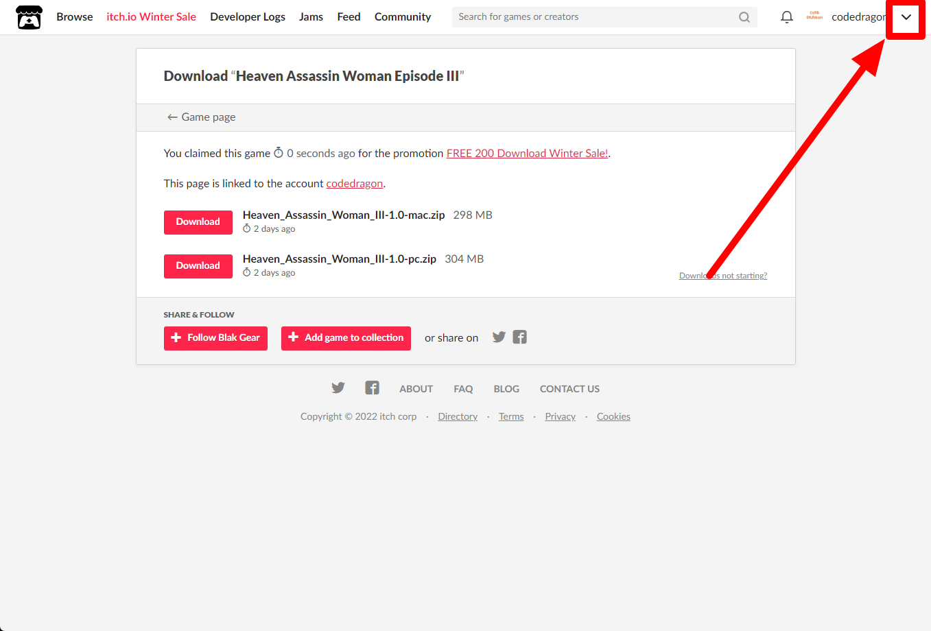 itch.io에서 받은 "Heaven Assassin Woman Episode III" 게임 확인하고 설치파일 다운받아 보겠습니다. 우측 상단의 나의 사용자명 오른쪽의 화살표 아이콘을 클릭합니다.