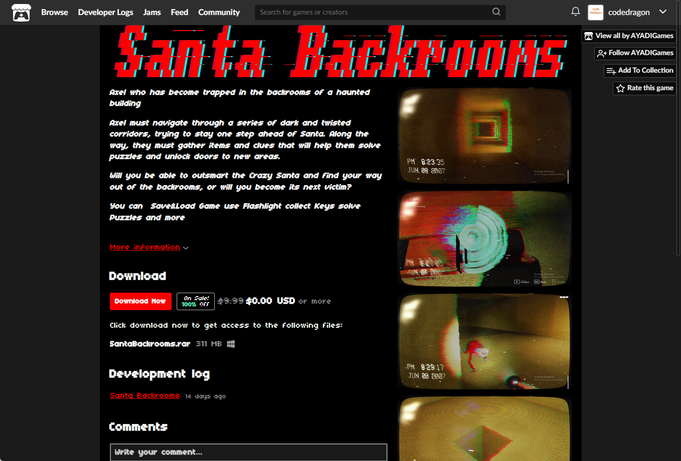 "Santa Backrooms" 해당 항목에 있는 [Download] 버튼을 클릭하면 게임의 설치파일을 다운받을 수 있습니다.