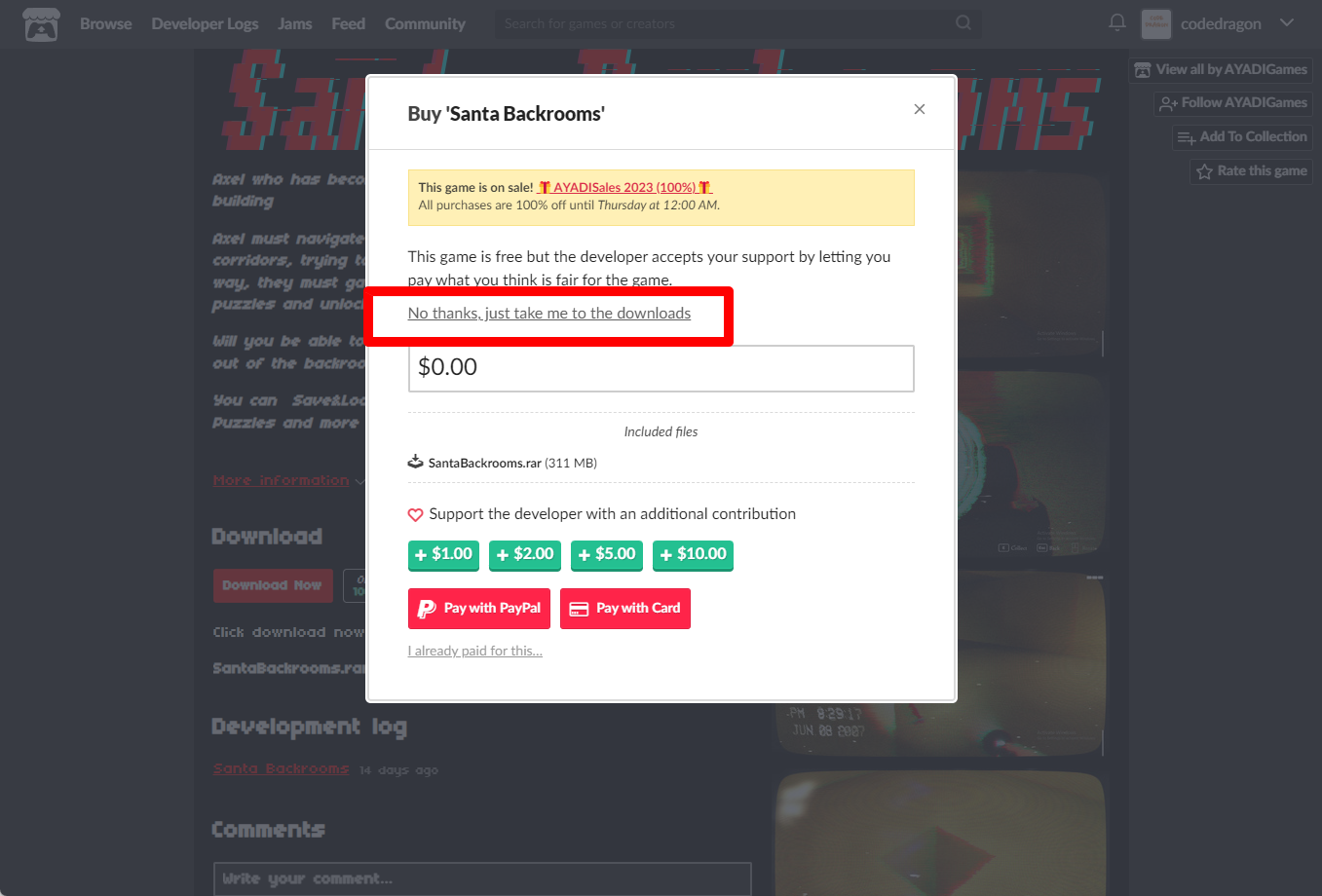 "Santa Backrooms" 구매창에서 [No thanks, just take me to the downloads] 링크를 클릭합니다.
