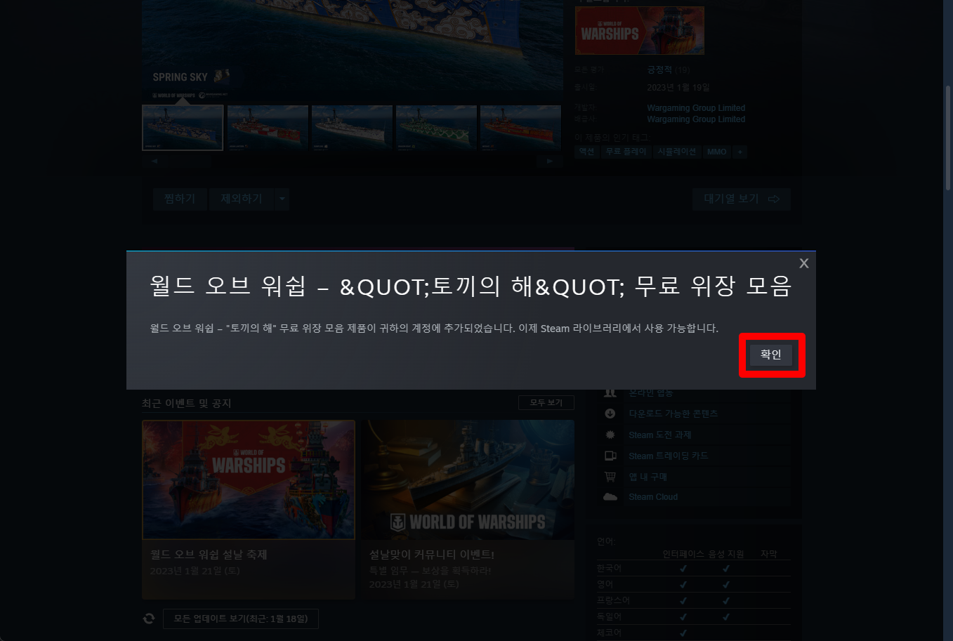 "World of Warships Year of the Rabbit Camouflage Collection" 라이브러리 추가 확인 팝업창에서 [확인] 버튼 클릭합니다.