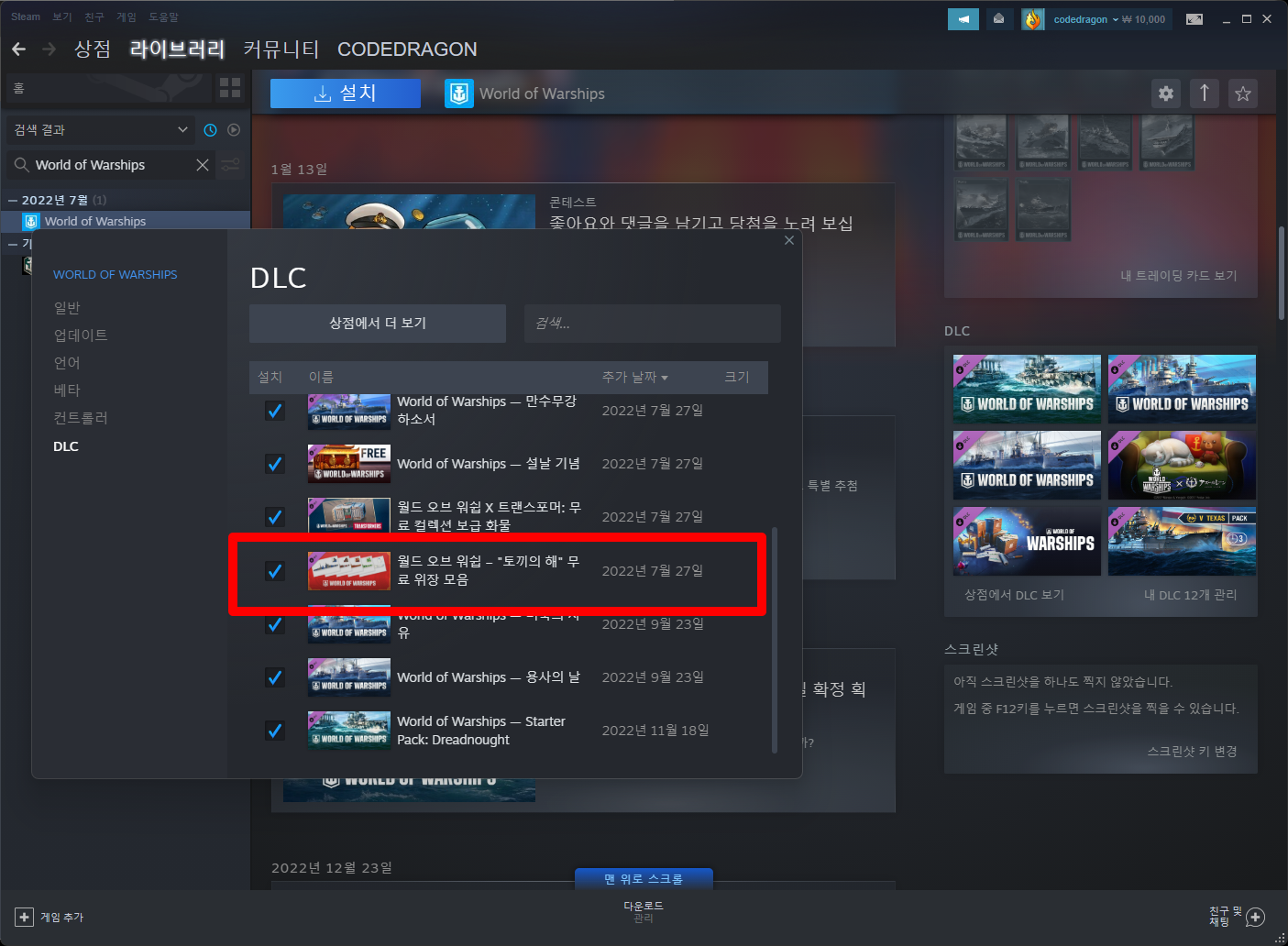 DLC관리창에서 방금 받은 "World of Warships Year of the Rabbit Camouflage Collection" DLC 항목을 확인할 수 있습니다.