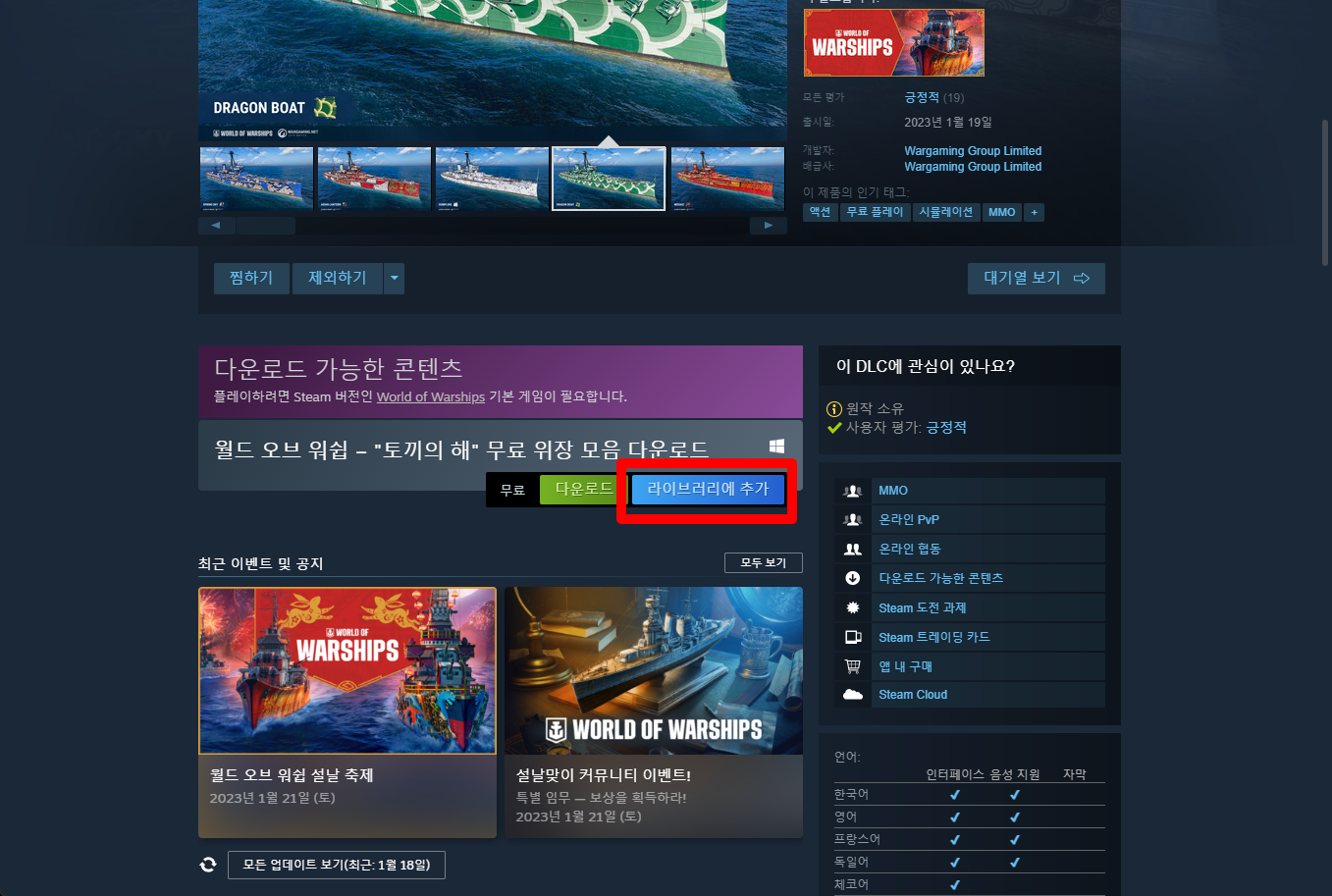"World of Warships Year of the Rabbit Camouflage Collection" 게임페이지를 조금 내려준 후 [라이브러리에 추가] 버튼을 클릭하면 게임라이브러리에 추가됩니다.
