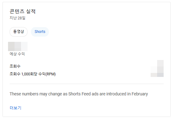 콘텐츠 실적항목의 "Shorts" 에서 예상 수익을 확인할 수 있습니다.