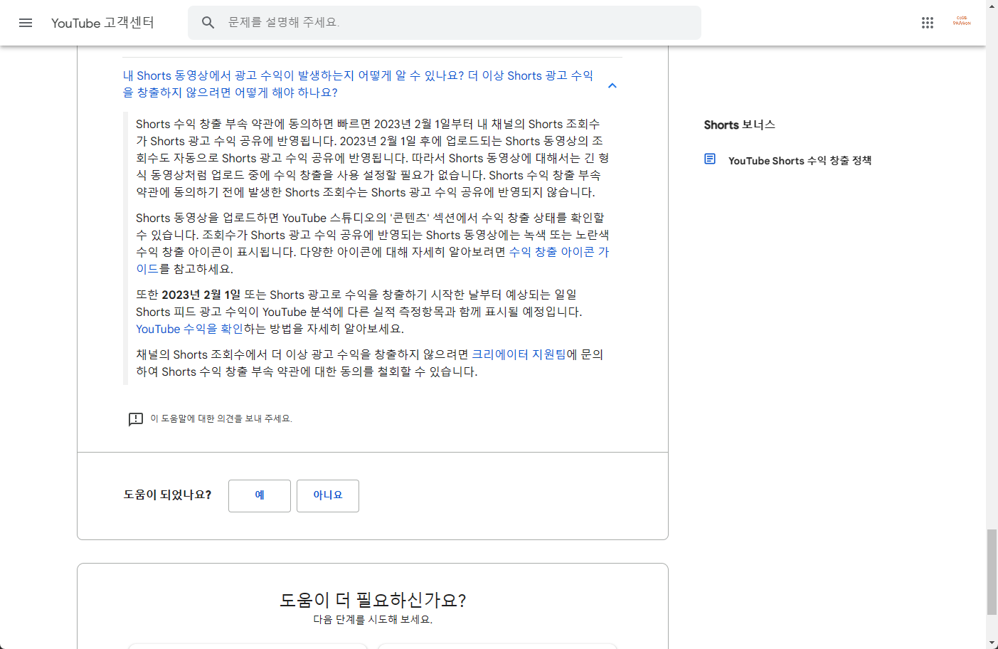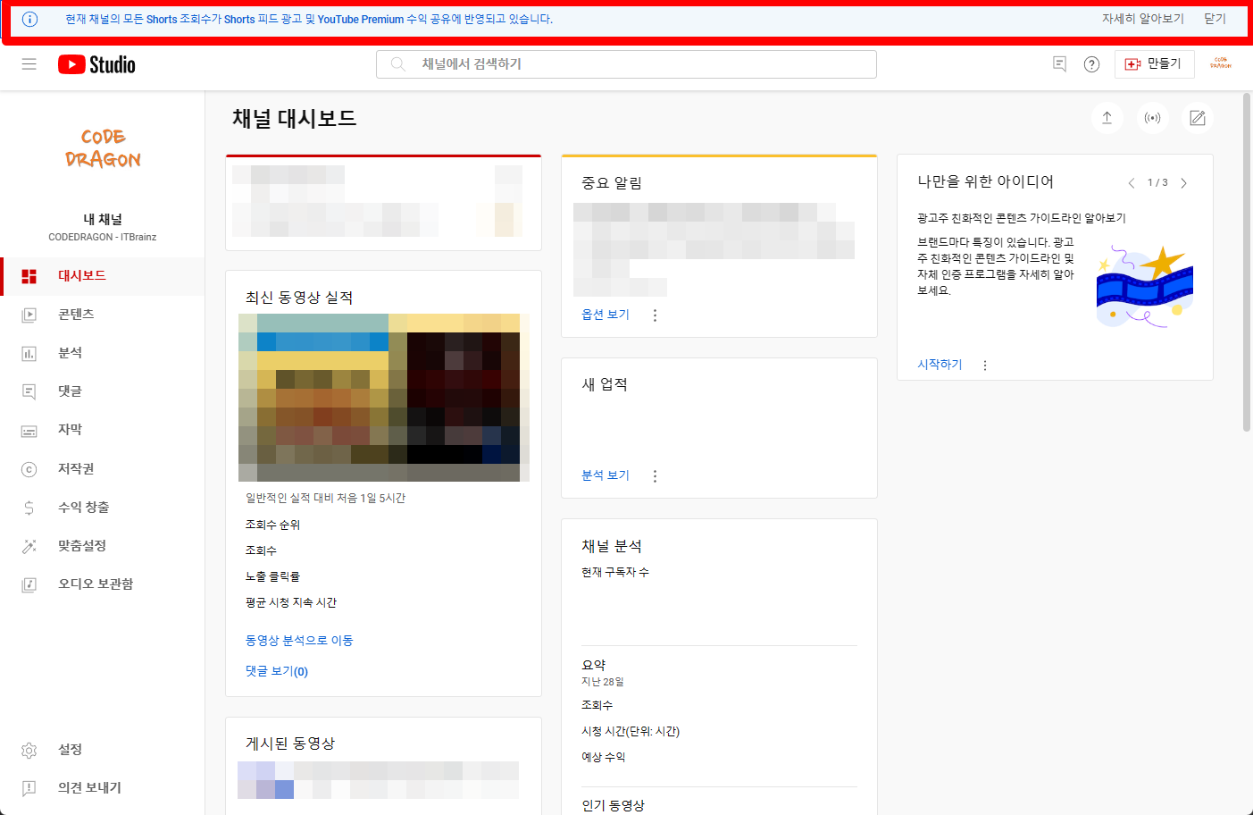 현재 채널의 모든 Shorts 조회수가 Shorts 피드 광고 및 YouTube Premium 수익 공유에 반영되고 있습니다.