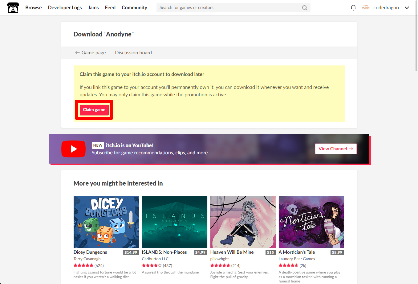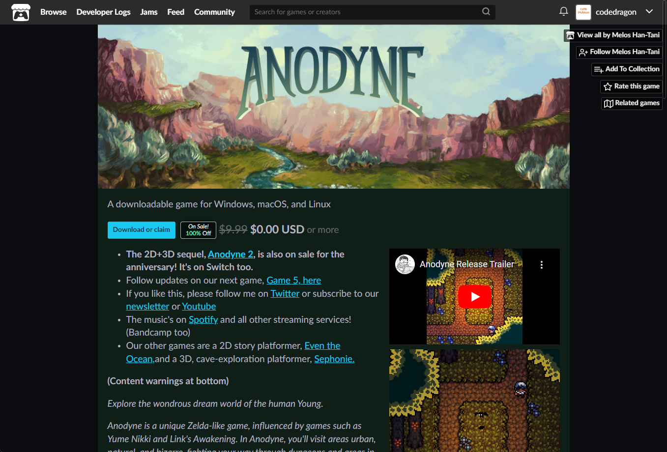 "Anodyne" 페이지에 있는 [Download or claim]을 클릭합니다.