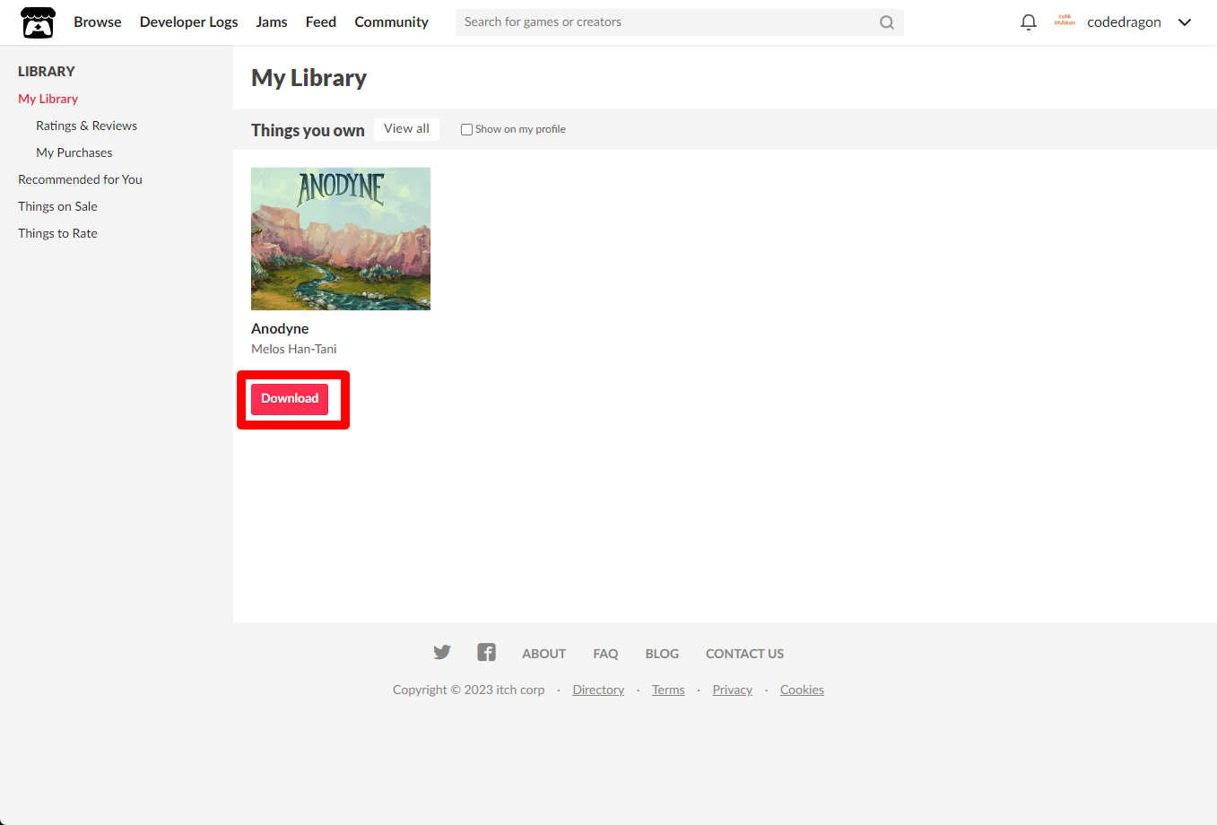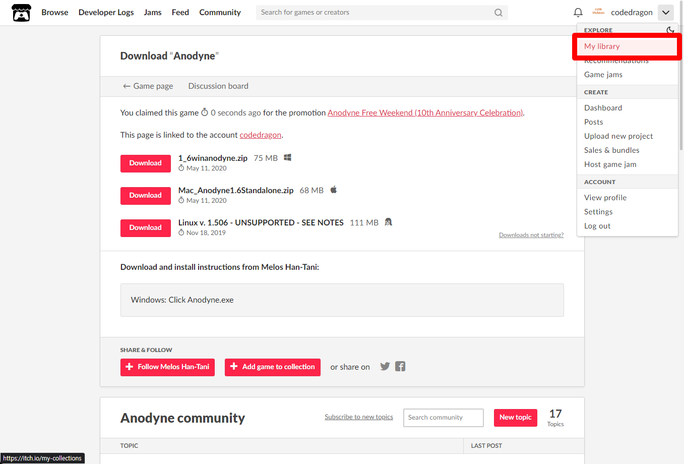 "Anodyne" 파일 다운로드 페이지에 나오는 메뉴에서 [My library]를 클릭합니다.
