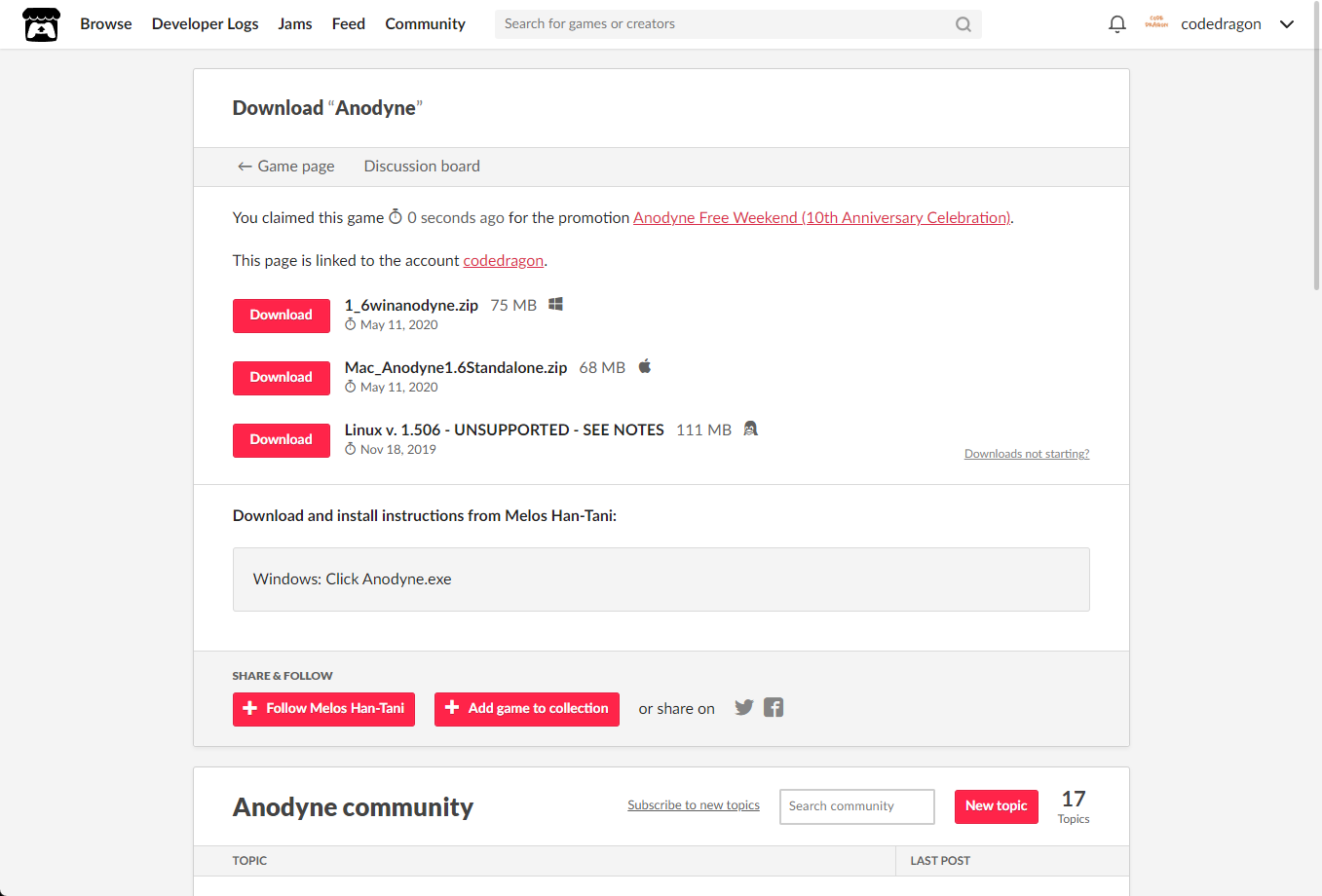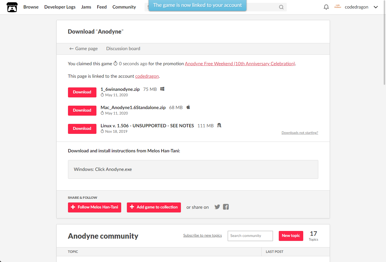 "Anodyne" 페이지에 있는 [Download or claim]을 클릭합니다.