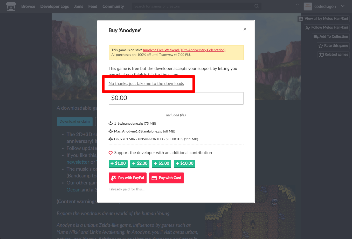 "Anodyne" 구매창에서 [No thanks, just take me to the downloads] 링크를 클릭합니다.