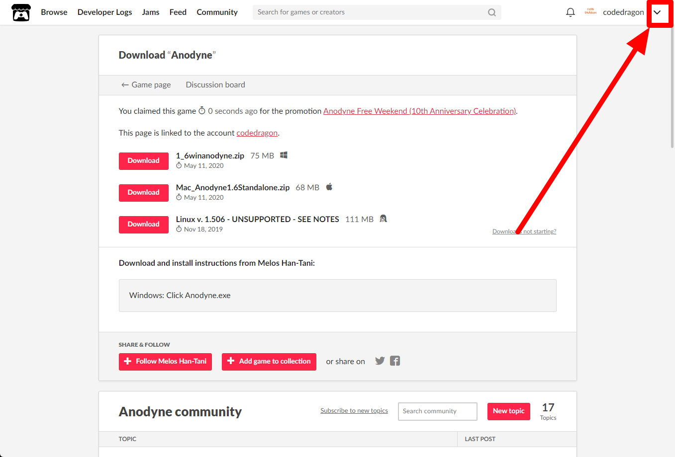 itch.io에서 받은 "Anodyne" 게임 확인하고 설치파일 다운받아 보겠습니다. 우측 상단의 나의 사용자명 오른쪽의 화살표 아이콘을 클릭합니다.