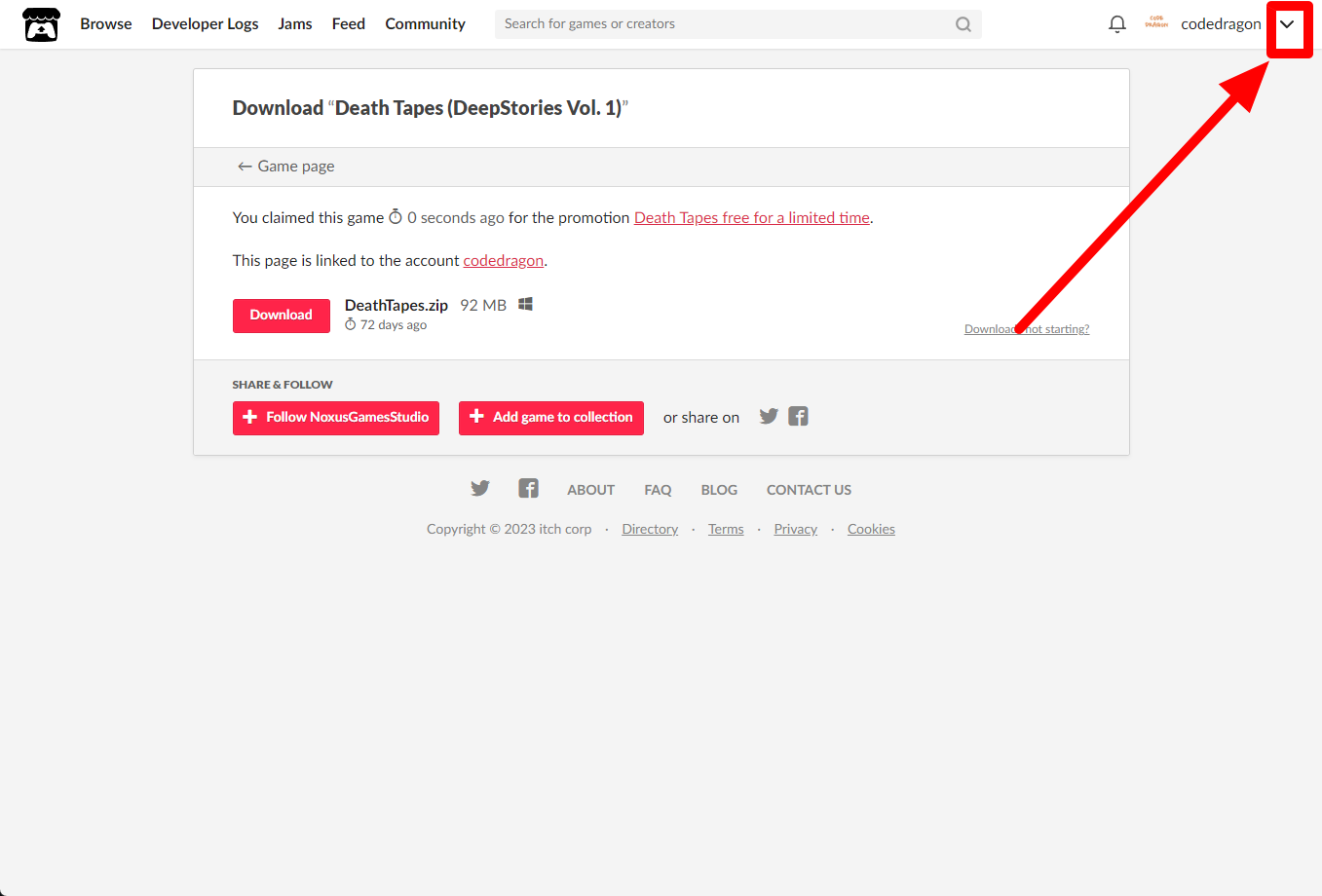 itch.io에서 받은 "Death Tapes (DeepStories Vol. 1)" 게임 확인하고 설치파일 다운받아 보겠습니다. 우측 상단의 나의 사용자명 오른쪽의 화살표 아이콘을 클릭합니다.