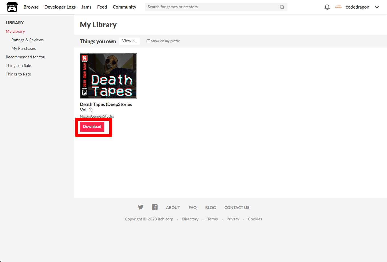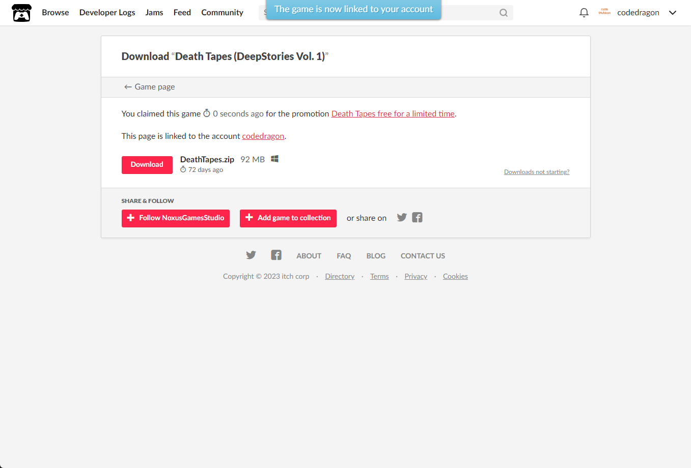 [Claim game]을 클릭하면 "Death Tapes (DeepStories Vol. 1)" 게임이 나의 게임 라이브러리에 추가되고 설치파일을 다운받을 수 있는 페이지로 이동됩니다.