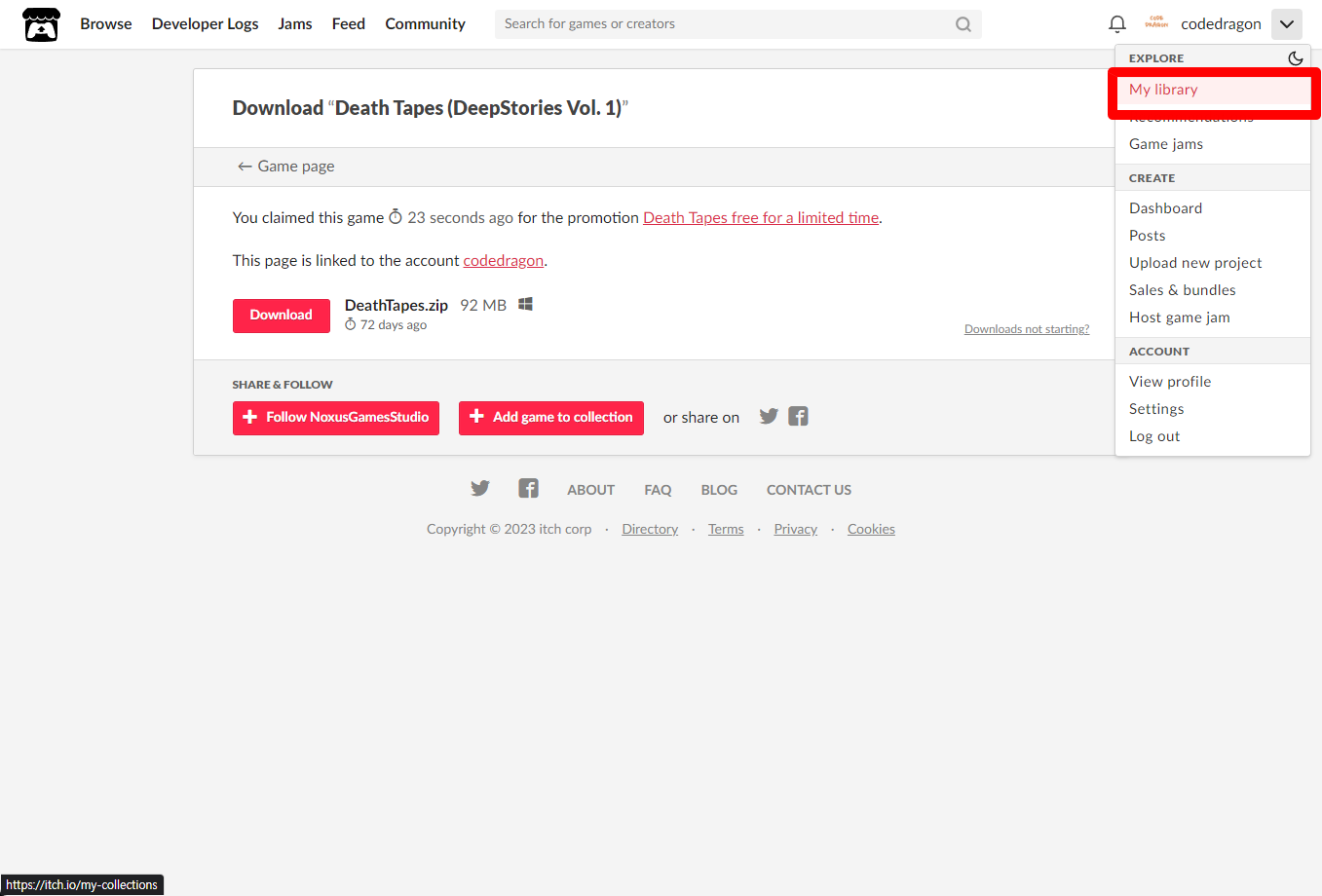 "Death Tapes (DeepStories Vol. 1)" 파일 다운로드 페이지에 나오는 메뉴에서 [My library]를 클릭합니다.