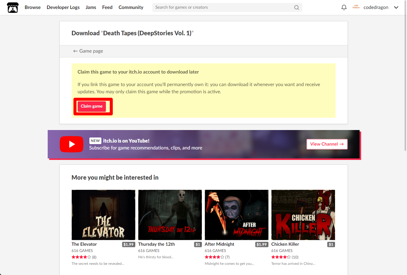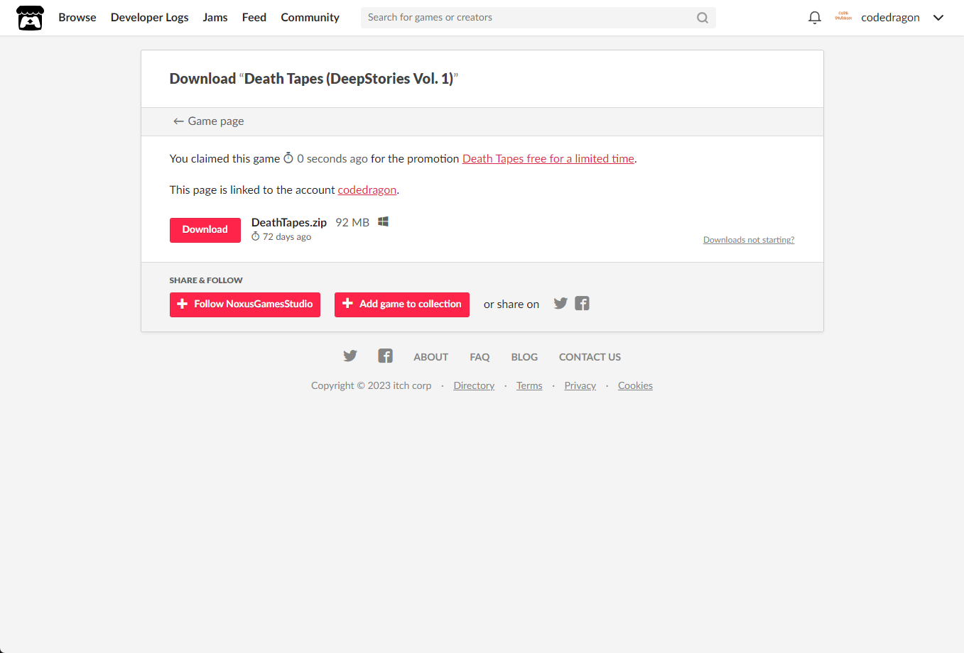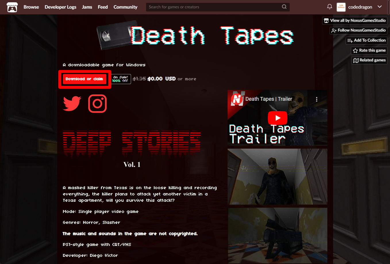 "Death Tapes (DeepStories Vol. 1)" 페이지에 있는 [Download or claim]을 클릭합니다.