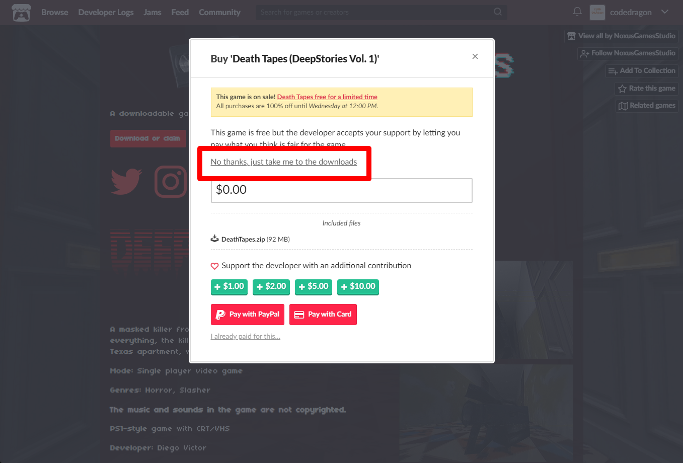 "Death Tapes (DeepStories Vol. 1)" 구매창에서 [No thanks, just take me to the downloads] 링크를 클릭합니다.