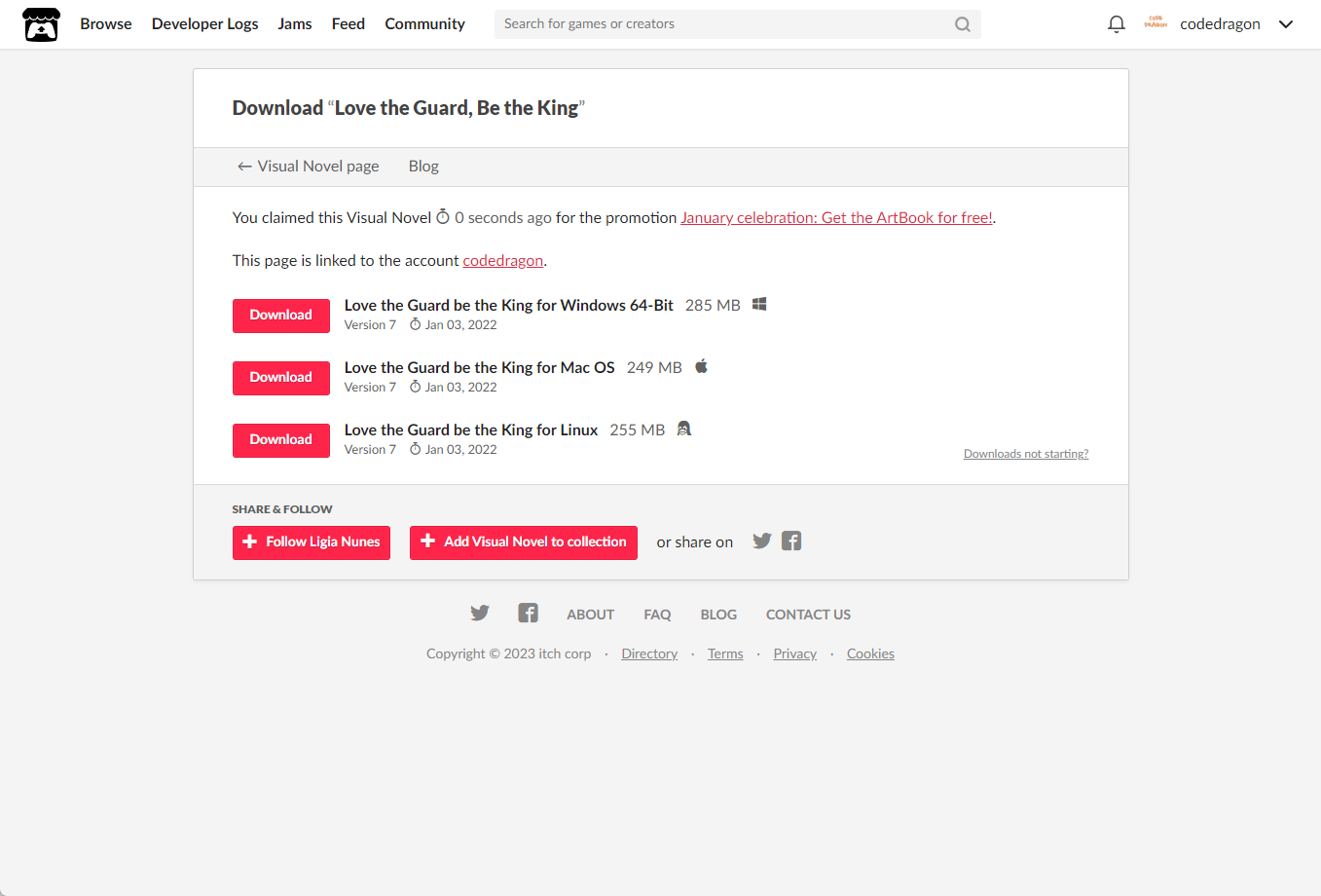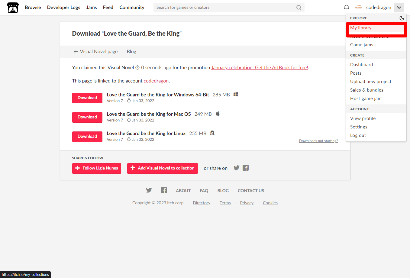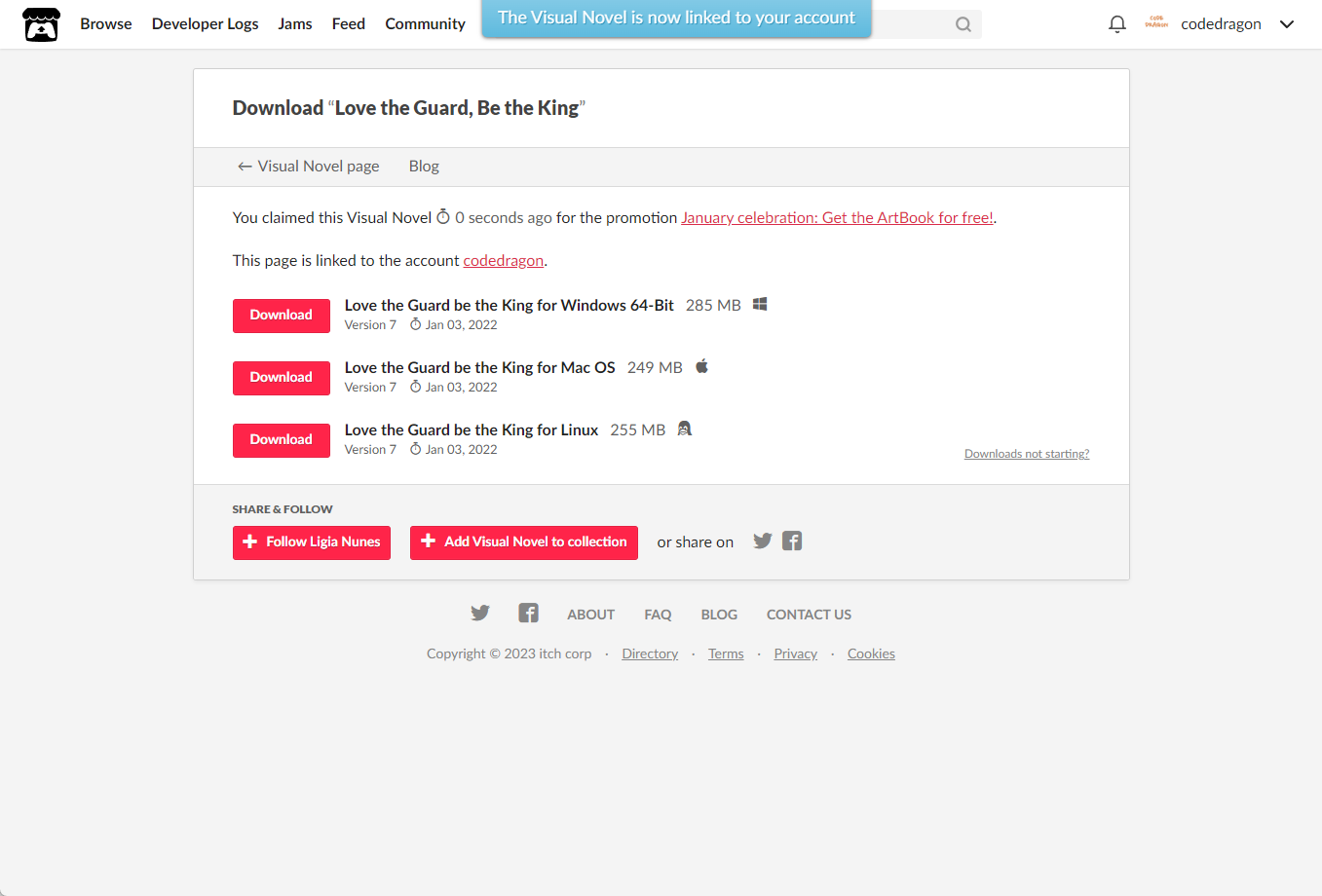 [Claim Visual Novel]을 클릭하면 "Love the Guard, Be the King" 게임이 나의 게임 라이브러리에 추가되고 설치파일을 다운받을 수 있는 페이지로 이동됩니다.