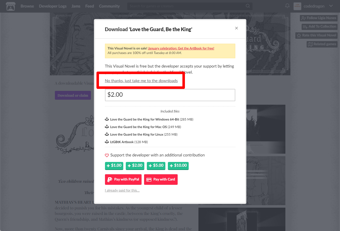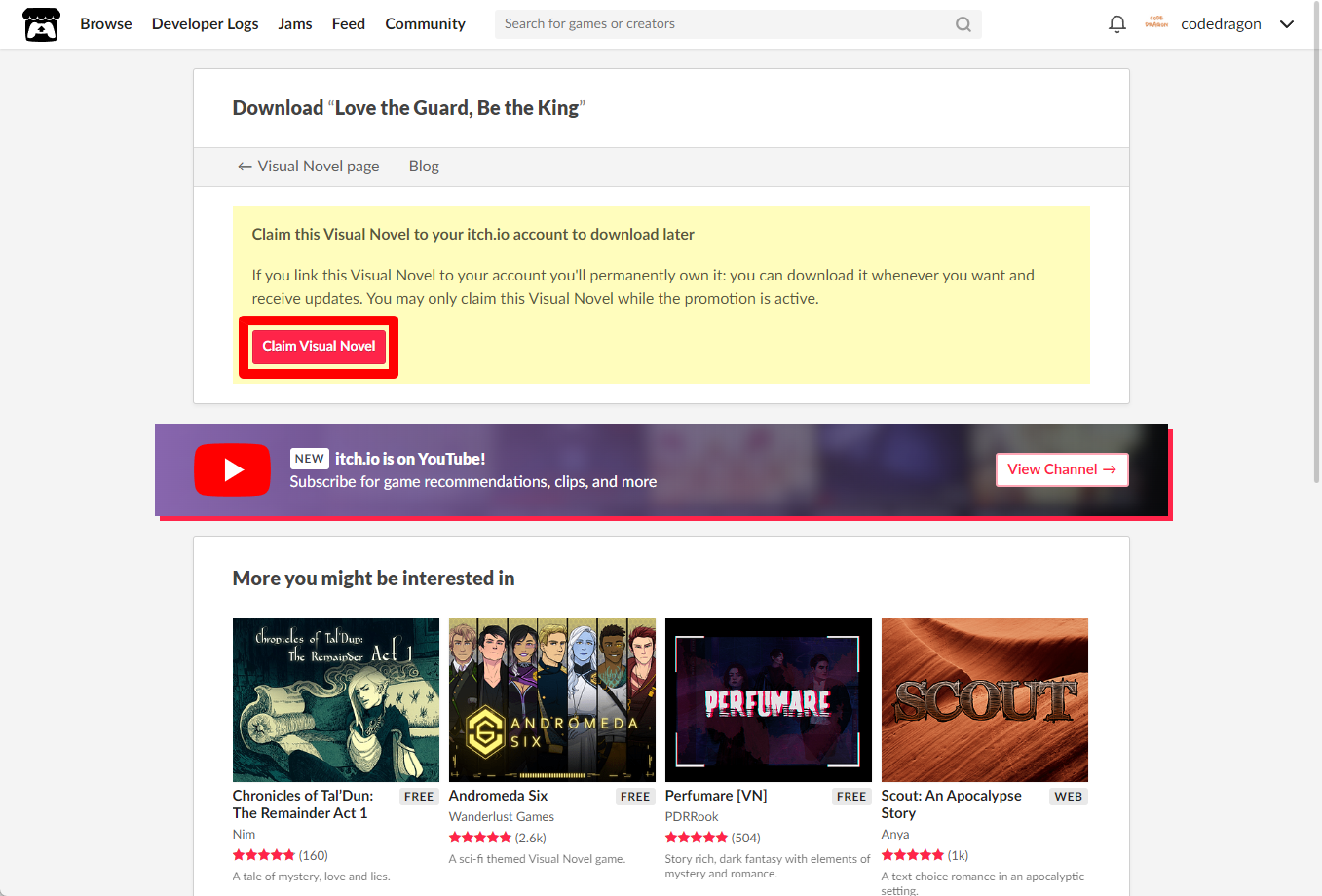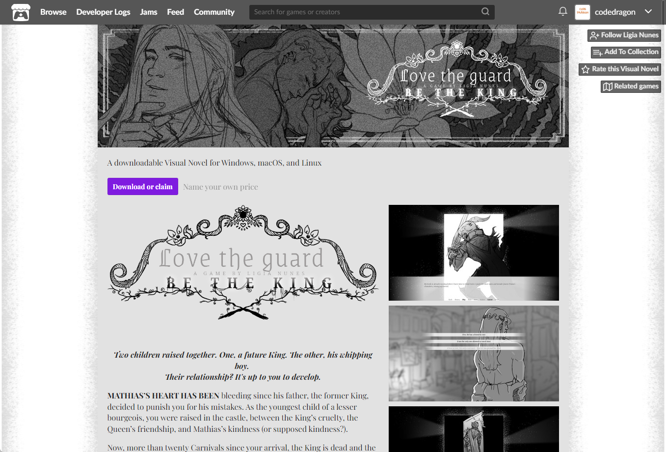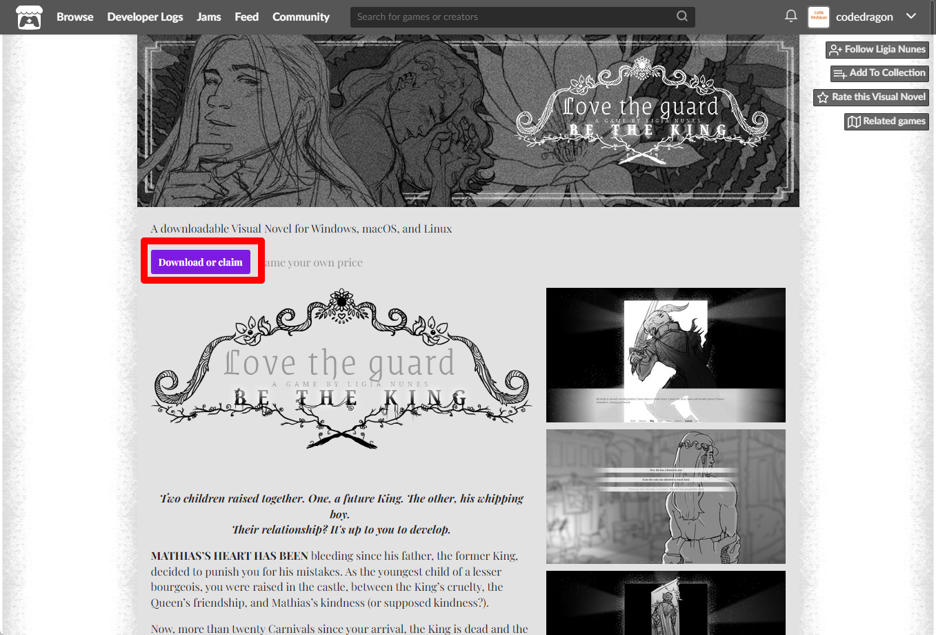 [Claim Visual Novel]을 클릭하면 "Love the Guard, Be the King" 게임이 나의 게임 라이브러리에 추가되고 설치파일을 다운받을 수 있는 페이지로 이동됩니다.