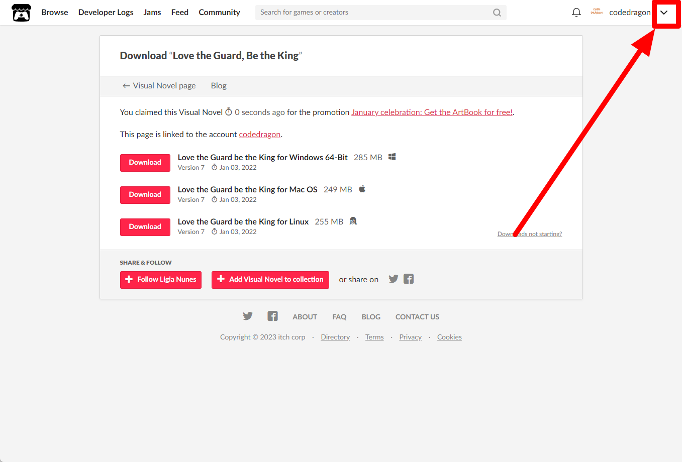 itch.io에서 받은 "Love the Guard, Be the King" 게임 확인하고 설치파일 다운받아 보겠습니다. 우측 상단의 나의 사용자명 오른쪽의 화살표 아이콘을 클릭합니다.