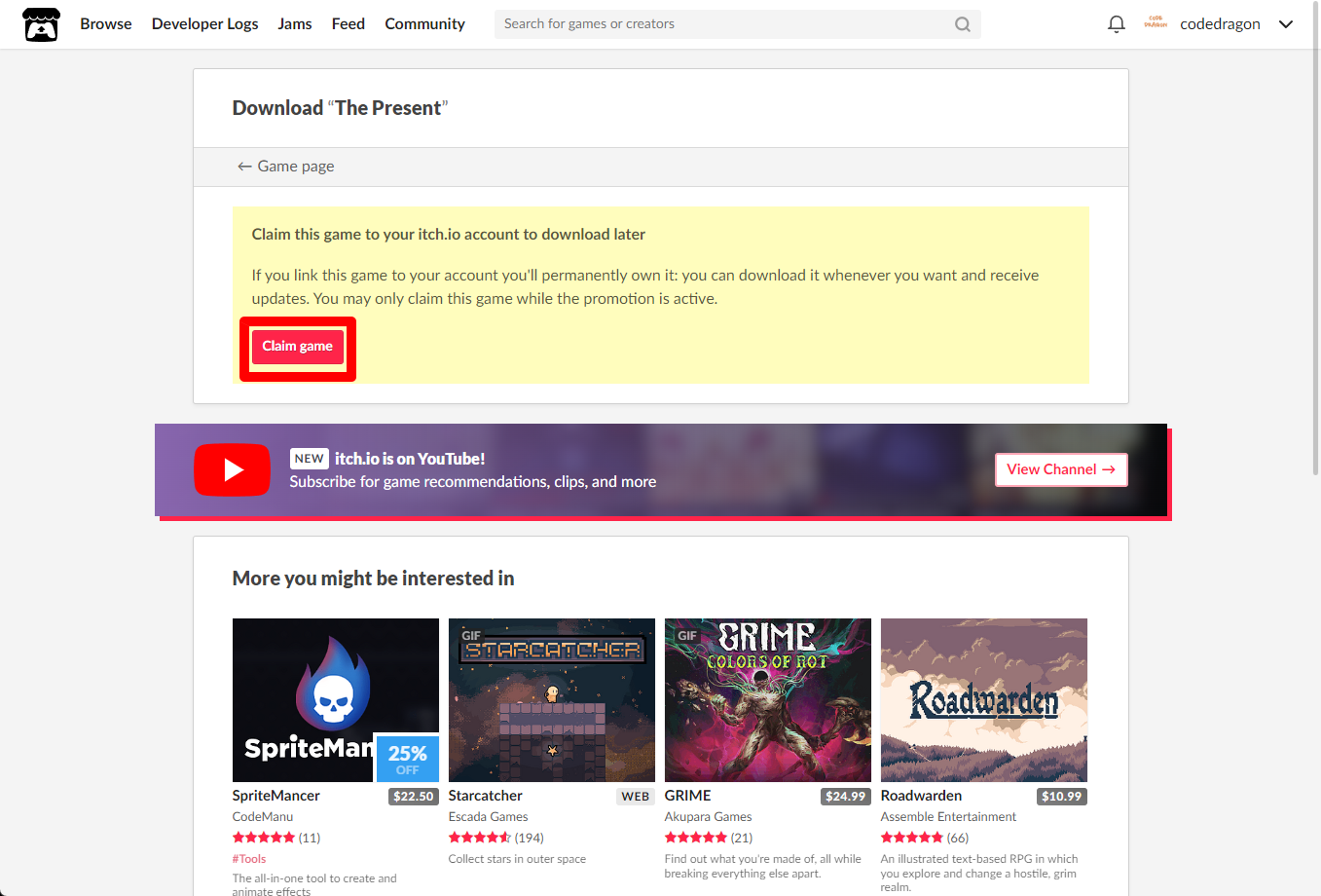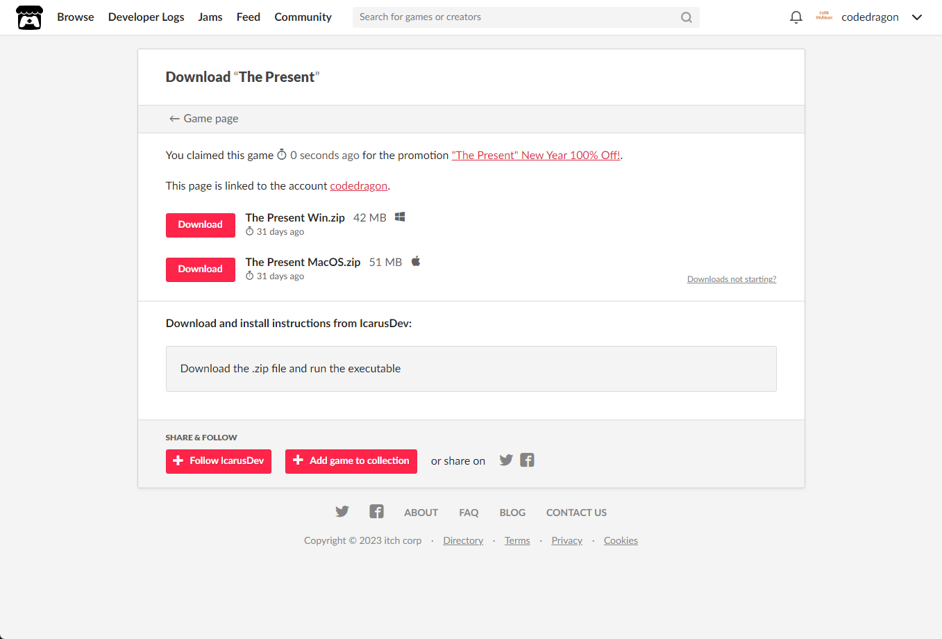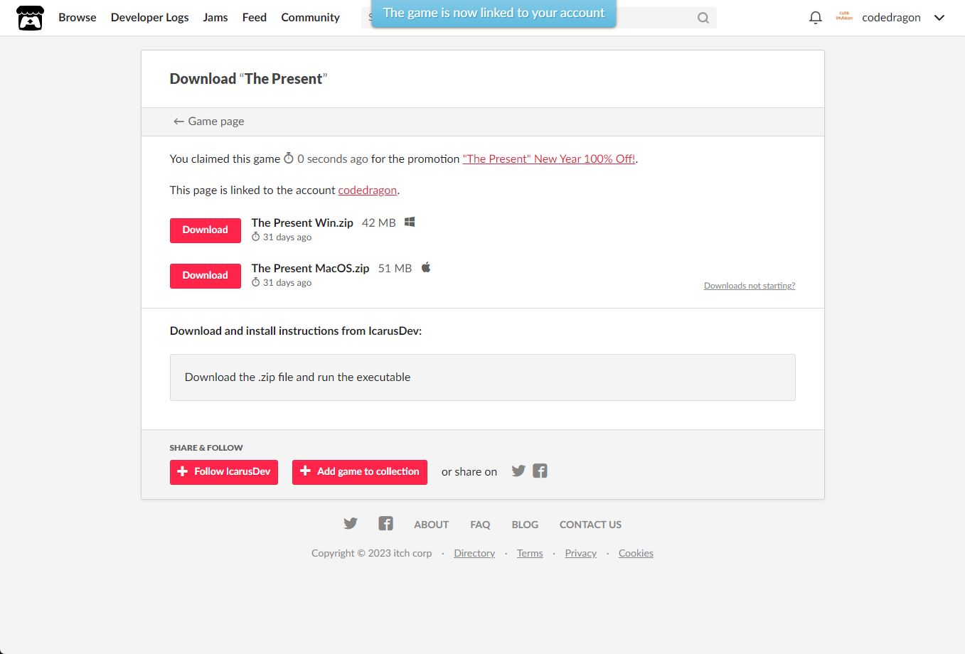 [Claim game]을 클릭하면 "The Present" 게임이 나의 게임 라이브러리에 추가되고 설치파일을 다운받을 수 있는 페이지로 이동됩니다.