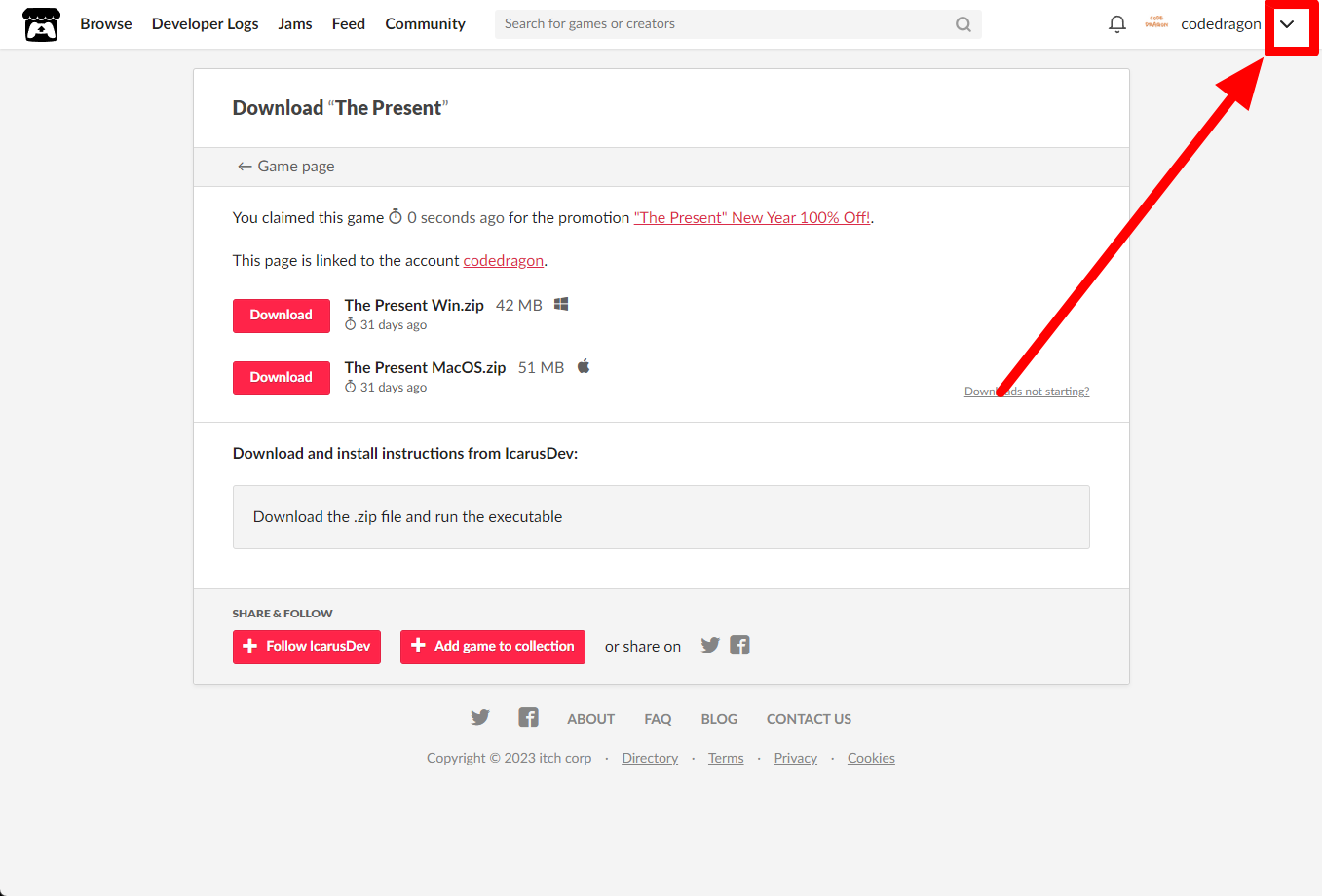 itch.io에서 받은 "The Present" 게임 확인하고 설치파일 다운받아 보겠습니다. 우측 상단의 나의 사용자명 오른쪽의 화살표 아이콘을 클릭합니다.