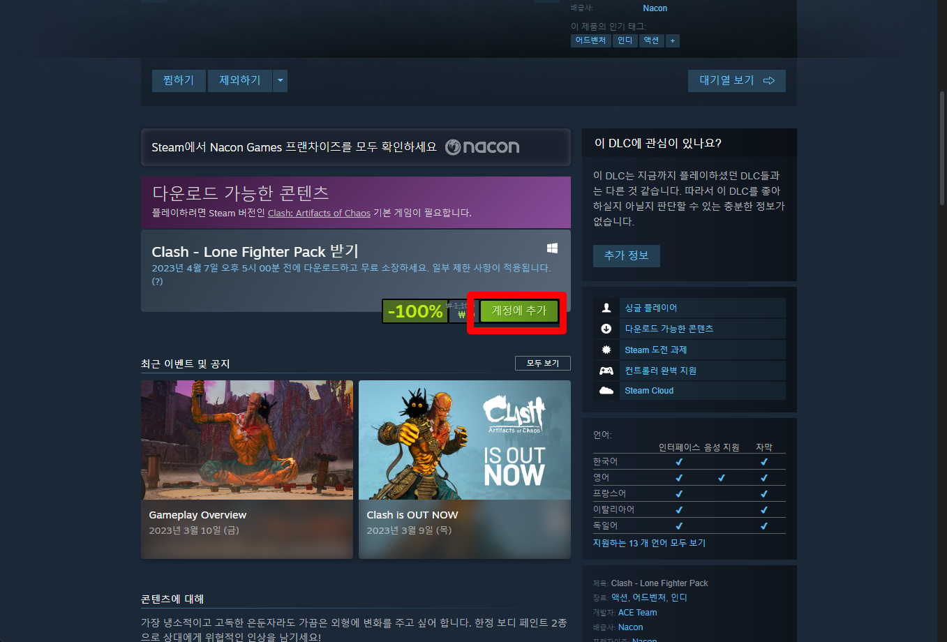"Clash - Lone Fighter Pack" 게임페이지를 조금 내려준 후 [계정에 추가] 버튼을 클릭하면 게임라이브러리에 추가됩니다.