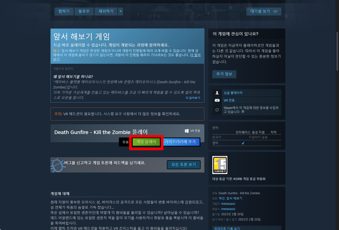 "Death Gunfire - Kill the Zombie" 페이지를 내려 [게임 플레이]를 클릭하면 됩니다.