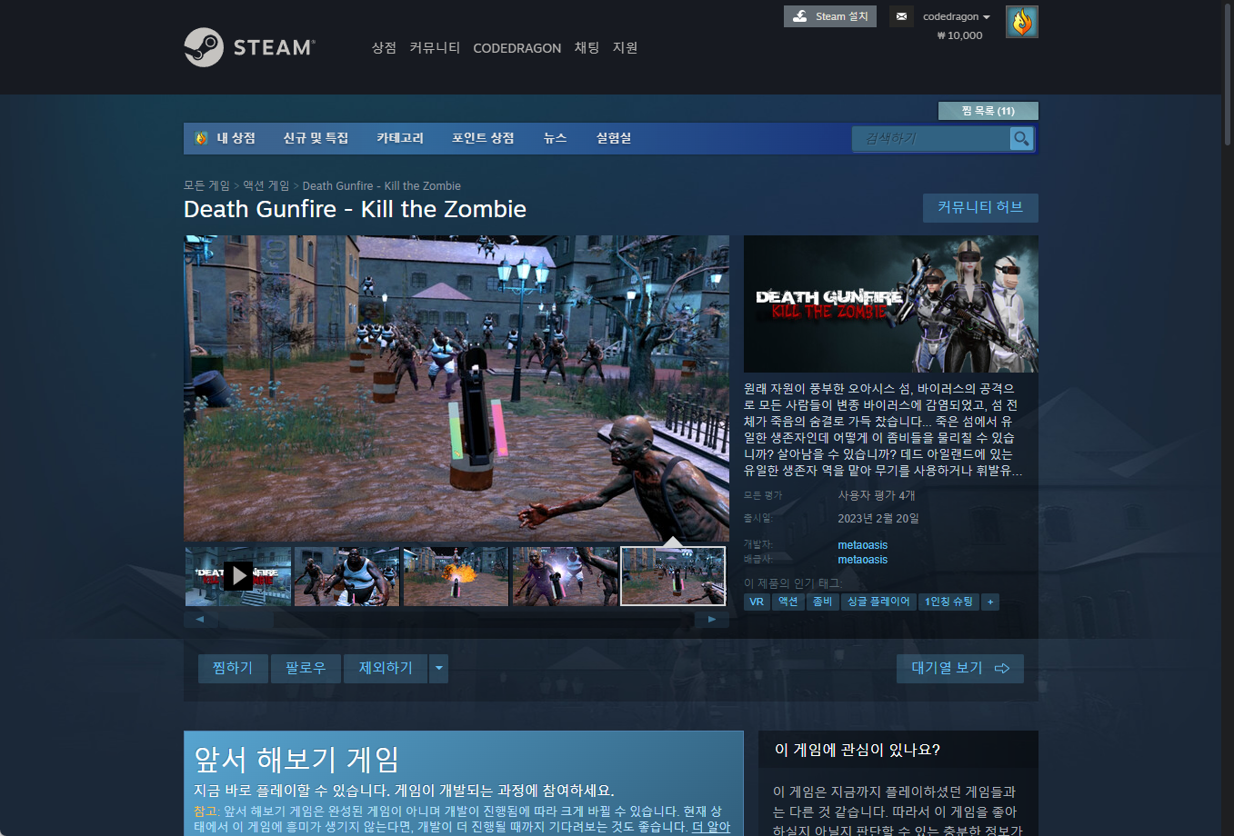 "Death Gunfire - Kill the Zombie" 스팀 페이지 입니다.