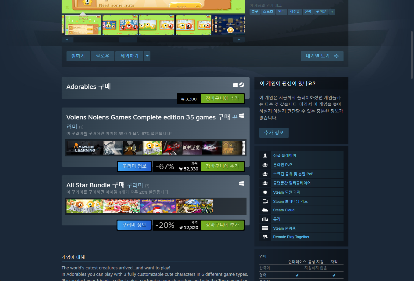 나의 계정의 라이브러리 안에서 "Adorables" 게임 가지고 있는 것 확인할 수 있으며 설치파일도 다운받을 수 있습니다.