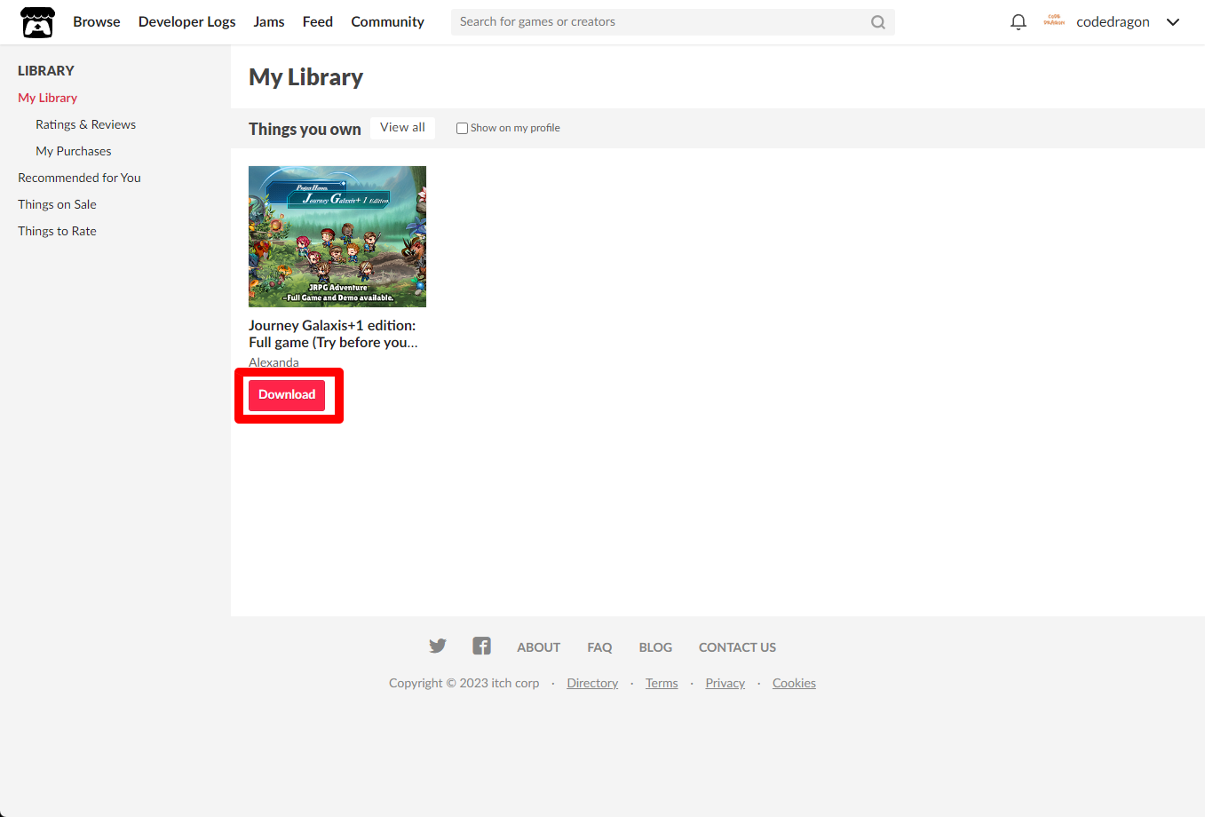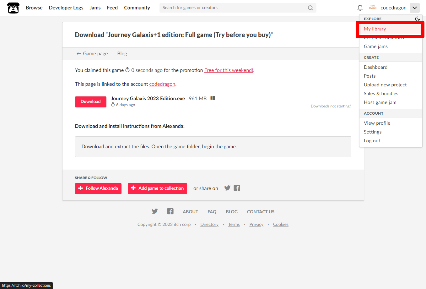 "Journey Galaxis+1 edition: Full game (Try before you buy)" 파일 다운로드 페이지에 나오는 메뉴에서 [My library]를 클릭합니다.