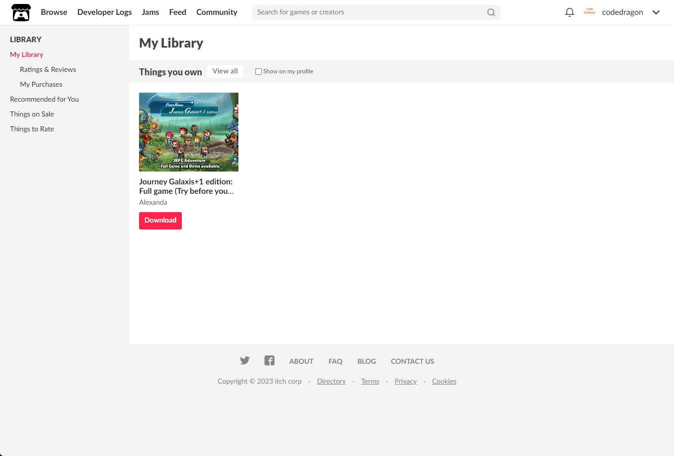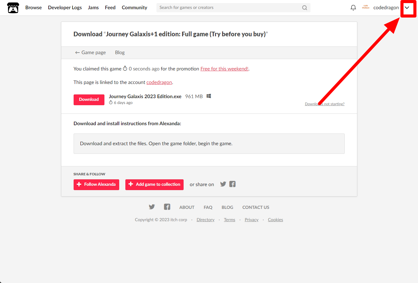 itch.io에서 받은 "Journey Galaxis+1 edition: Full game (Try before you buy)" 게임 확인하고 설치파일 다운받아 보겠습니다. 우측 상단의 나의 사용자명 오른쪽의 화살표 아이콘을 클릭합니다.