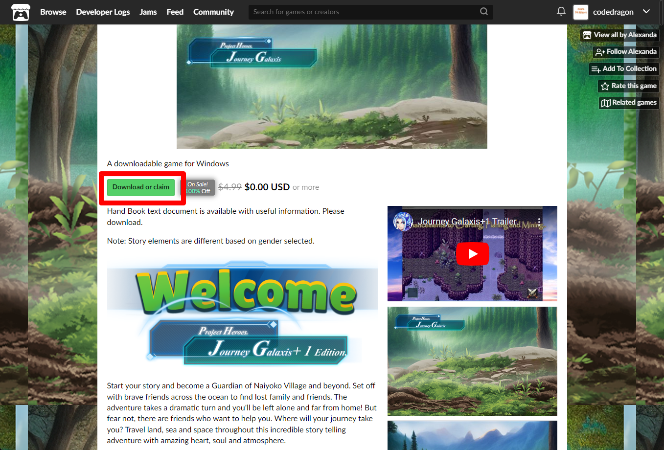 "Journey Galaxis+1 edition: Full game (Try before you buy)" 페이지에 있는 [Download or claim]을 클릭합니다.