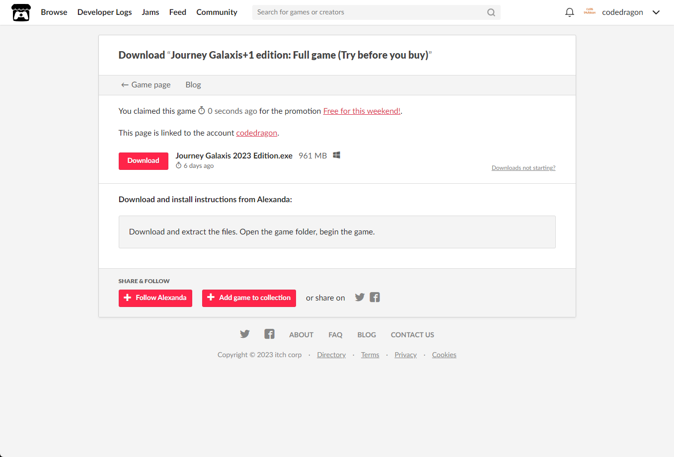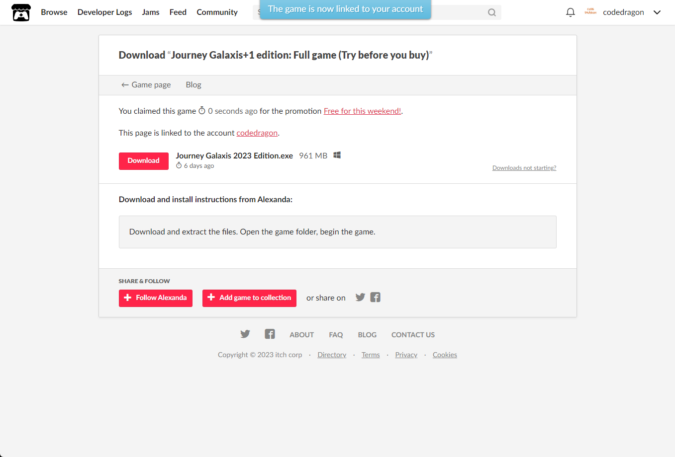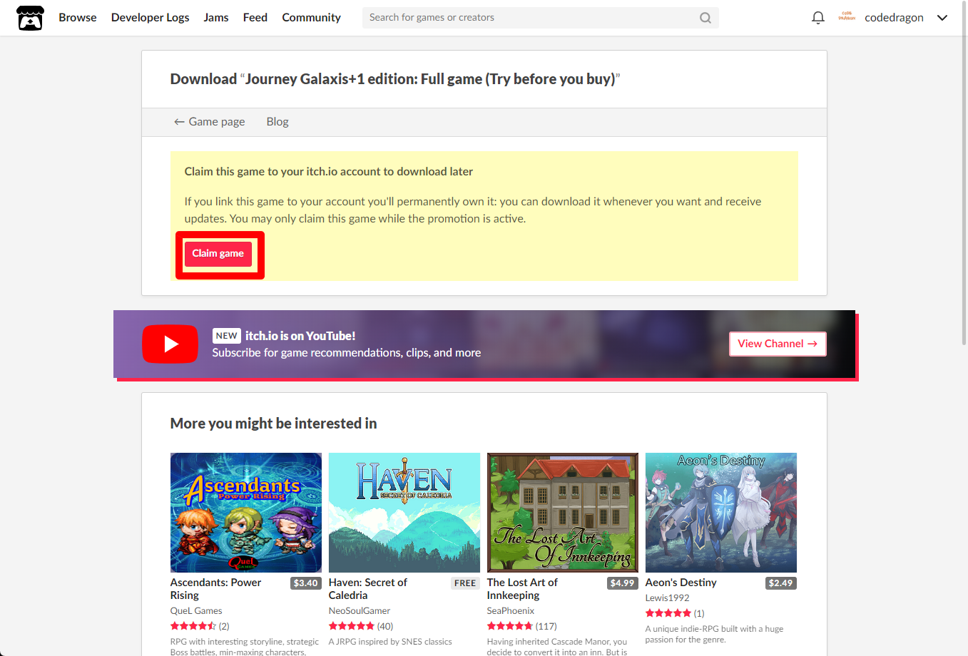 [Claim game]을 클릭하면 "Journey Galaxis+1 edition: Full game (Try before you buy)" 게임이 나의 게임 라이브러리에 추가되고 설치파일을 다운받을 수 있는 페이지로 이동됩니다.