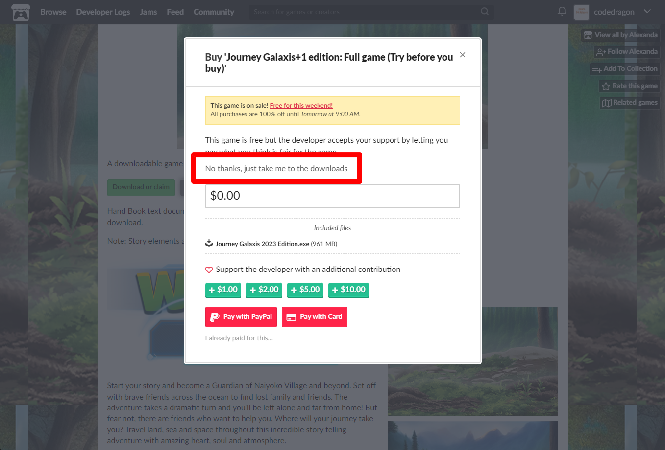 "Journey Galaxis+1 edition: Full game (Try before you buy)" 구매창에서 [No thanks, just take me to the downloads] 링크를 클릭합니다.