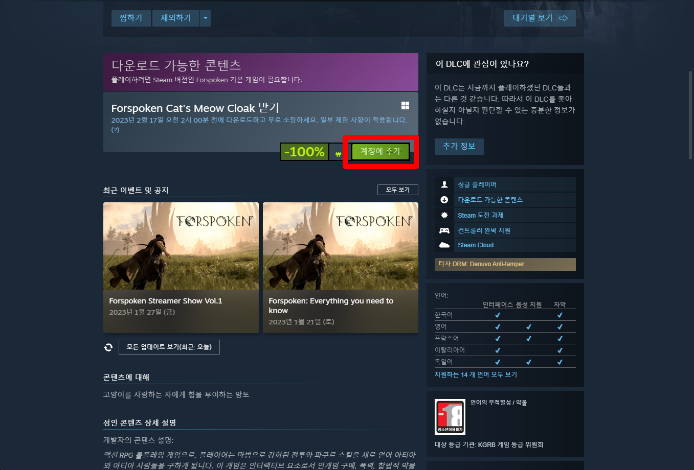 "Forspoken Cat's Meow Cloak" 게임페이지를 조금 내려준 후 [계정에 추가] 버튼을 클릭하면 게임라이브러리에 추가됩니다.