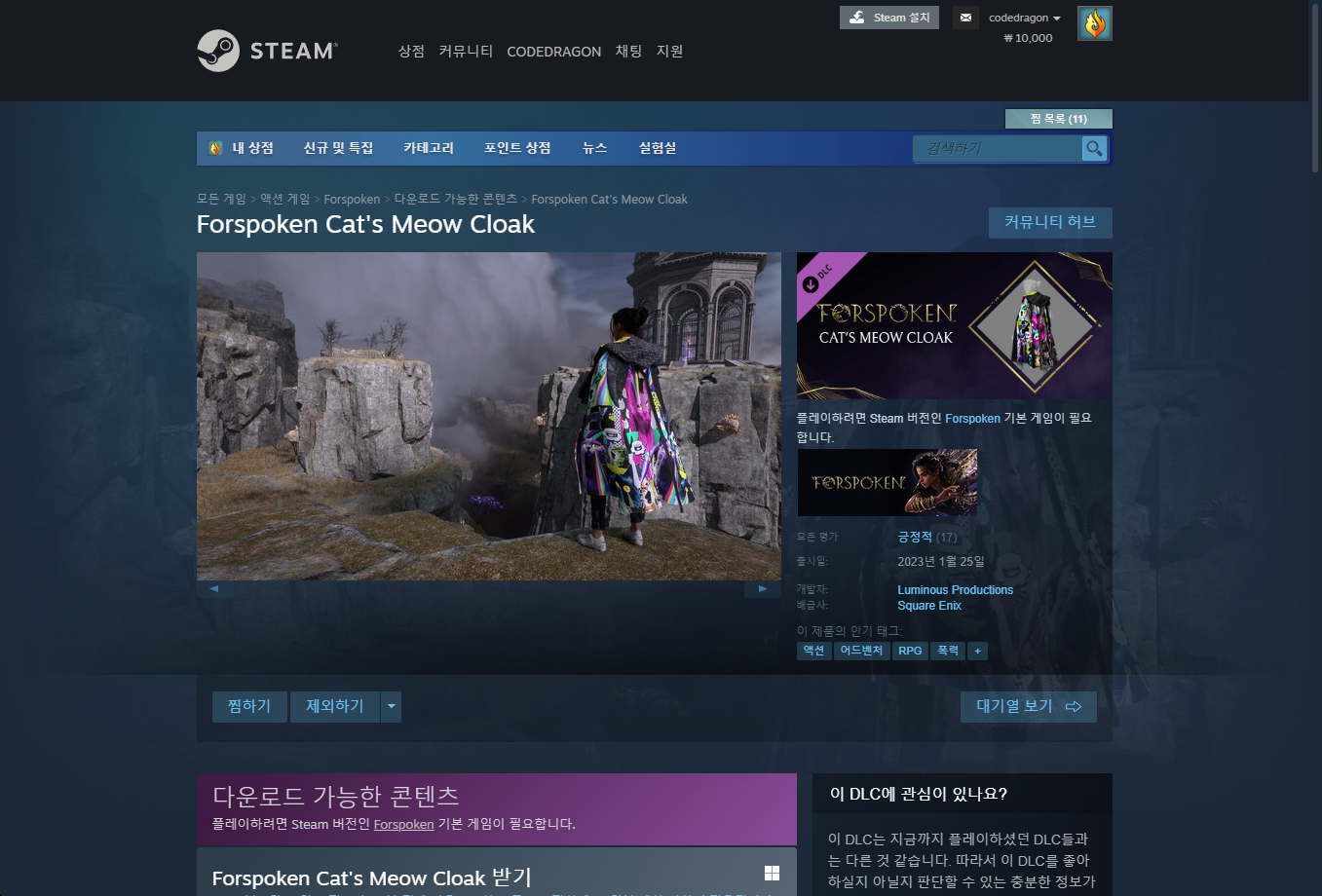 "Forspoken Cat's Meow Cloak" 게임 페이지 (DLC)