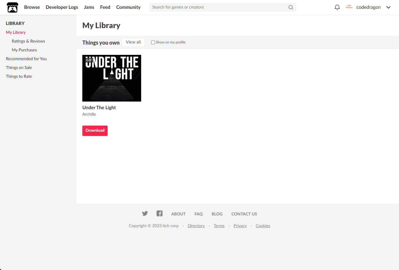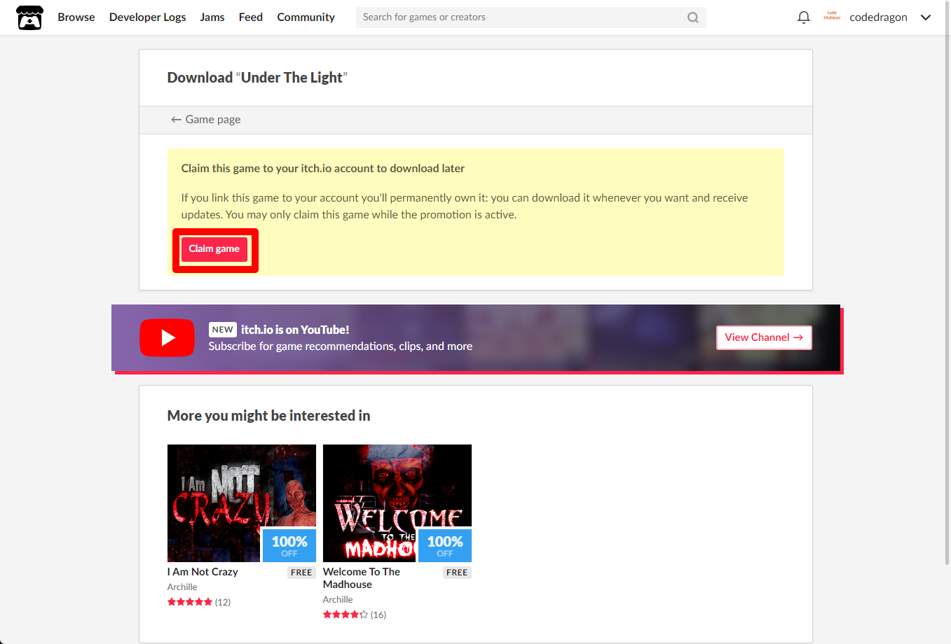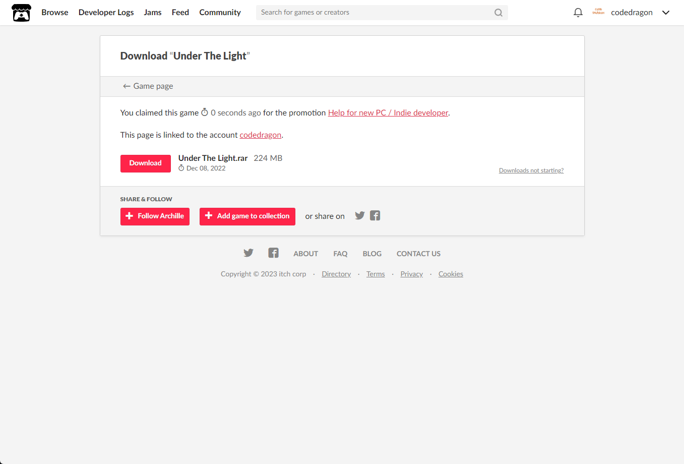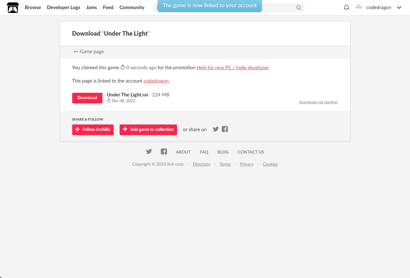 [Claim game]을 클릭하면 "Under The Light" 게임이 나의 게임 라이브러리에 추가되고 설치파일을 다운받을 수 있는 페이지로 이동됩니다.