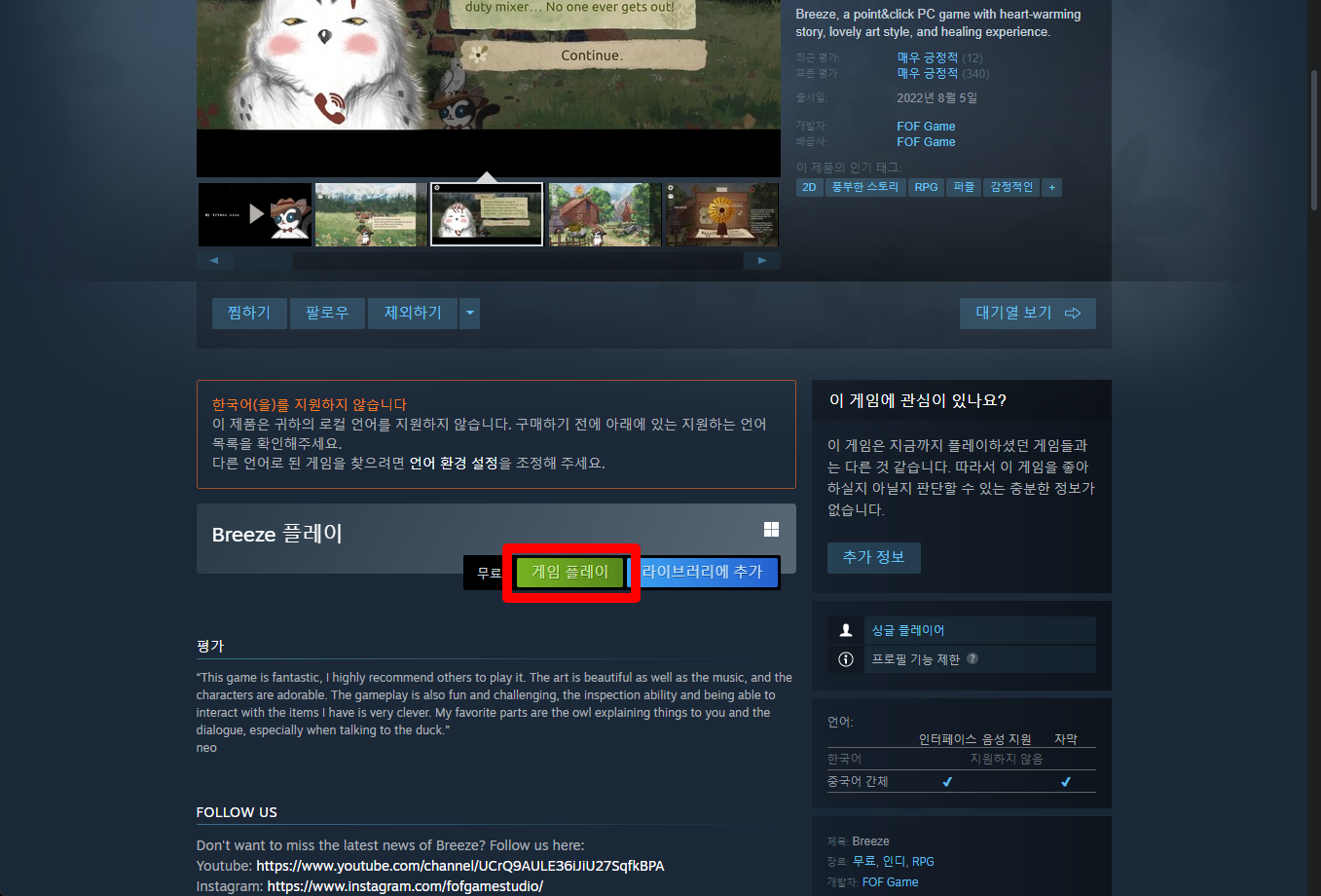 "Breeze" 페이지를 내려 [게임 플레이]를 클릭하면 됩니다.
