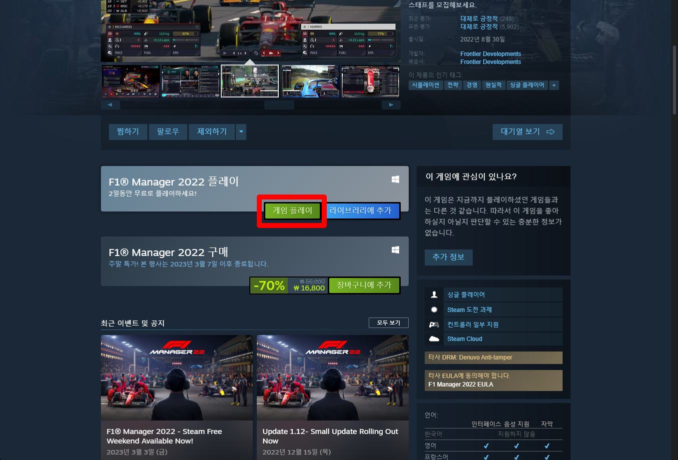"F1 Manager 2022" 게임페이지를 조금 내려서 [게임 플레이] 버튼을 클릭하면 됩니다.