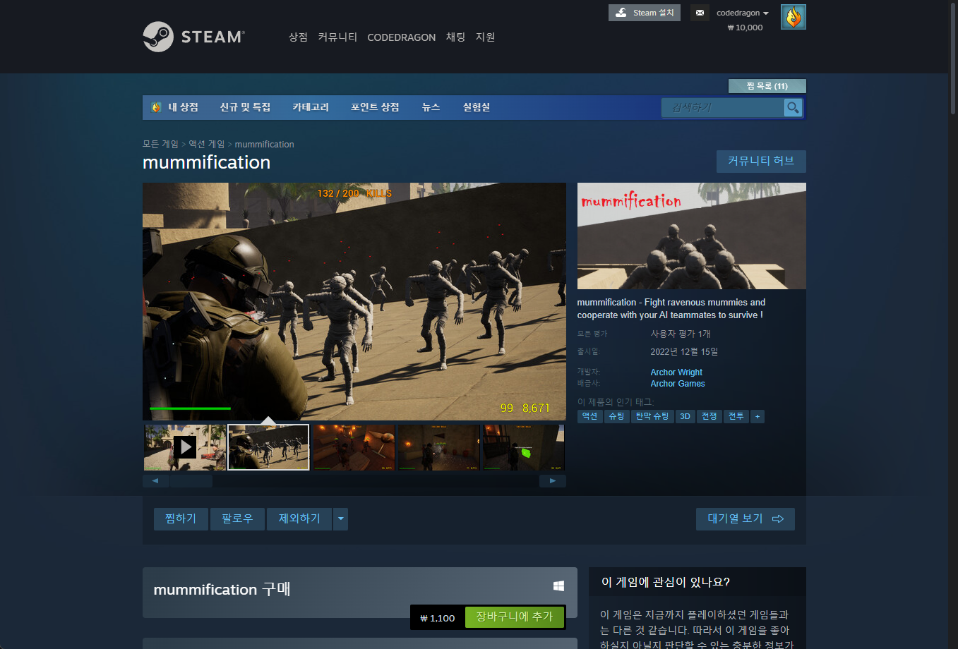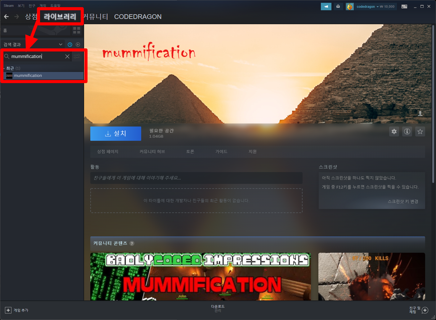 스팀 런처에서 상단에 있는 [라이브러리] 메뉴를 클릭합니다. 나의 게임 라이브러리에서 등록한 "mummification" 항목을 확인할 수 있습니다