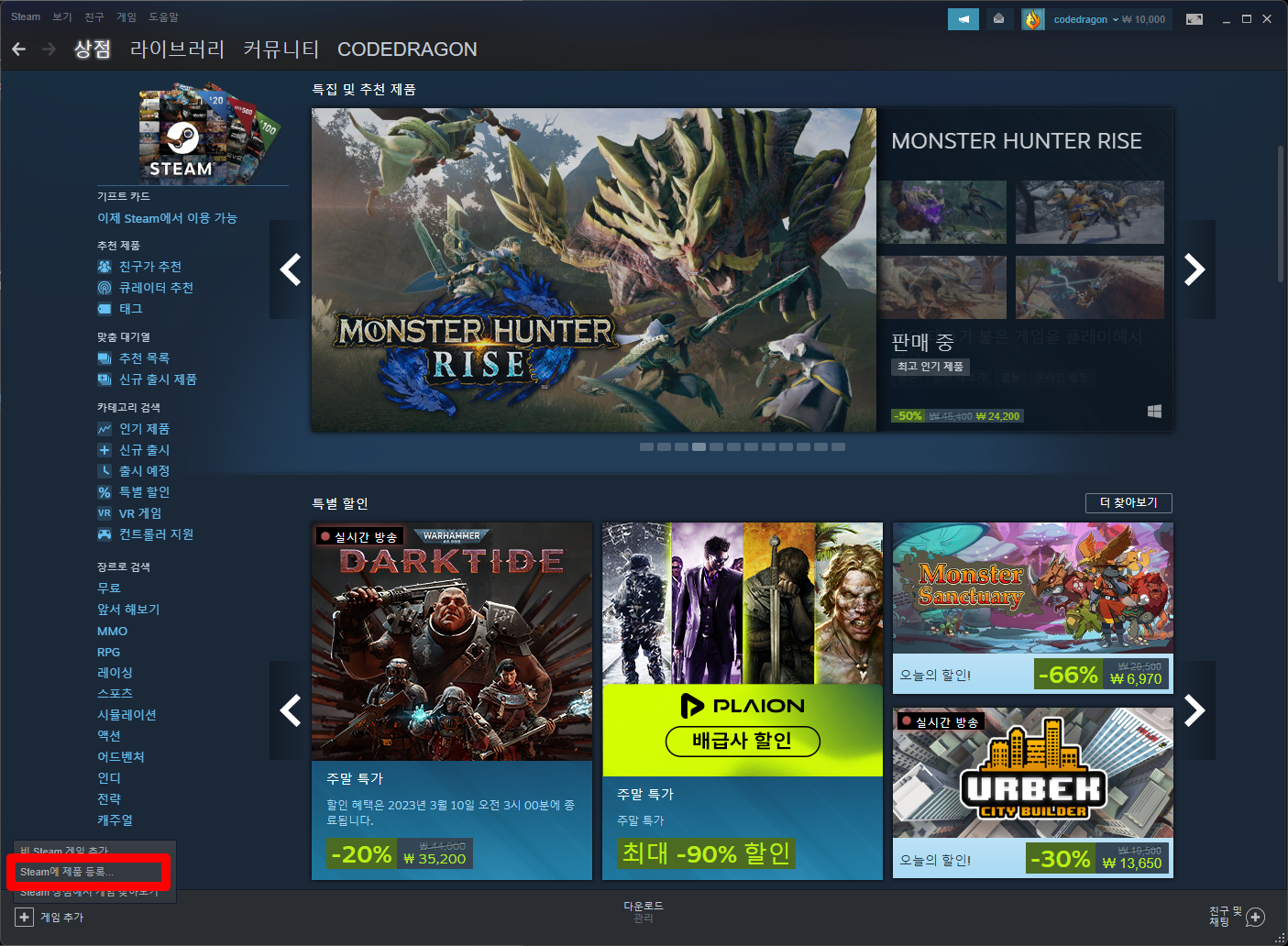 나오는 메뉴에서 [Steam에 제품 등록]을 클릭합니다.