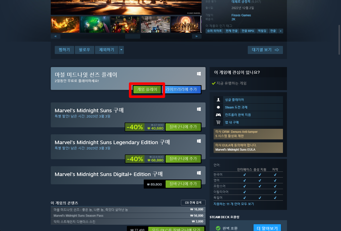 "Marvel's Midnight Suns" 게임페이지를 조금 내려서 [게임 플레이] 버튼을 클릭하면 됩니다.