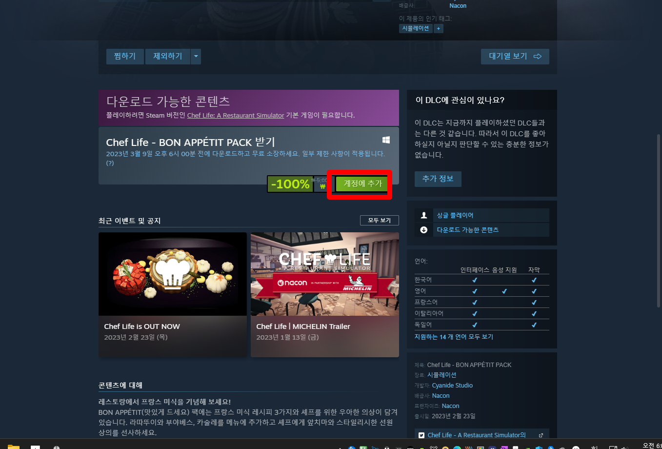 "Chef Life - BON APPÉTIT PACK" 게임페이지를 조금 내려준 후 [계정에 추가] 버튼을 클릭하면 게임라이브러리에 추가됩니다.