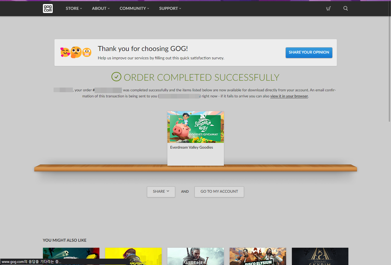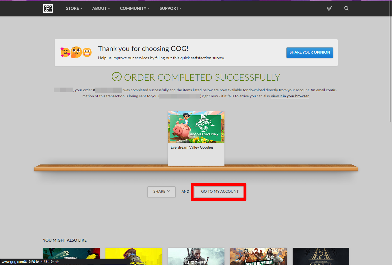 "Everdream Valley Goodies" 구매 완료페이지에서 [GO TO MY ACCOUNT]를 클릭합니다.