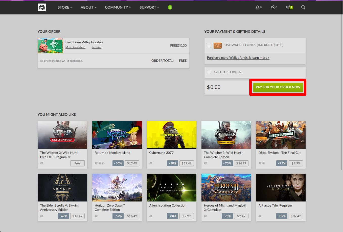 "Everdream Valley Goodies"게임이 담긴 상태에서 결제페이지로 이동됩니다. [PAY FOR YOUR ORDER NOW] 버튼을 클릭해서 0원으로 구매하겠습니다.