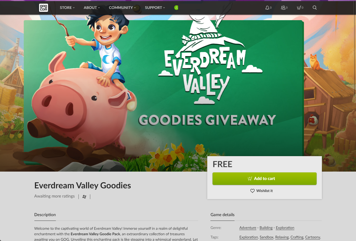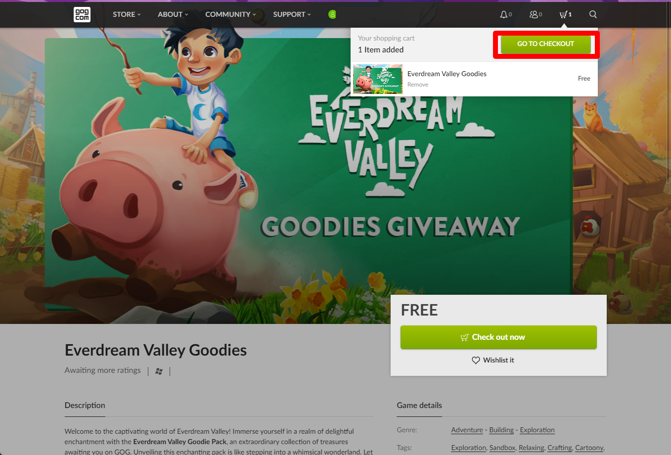 "Everdream Valley Goodies" 게임을 담기 위해 [Add to cart]버튼을 클릭합니다.